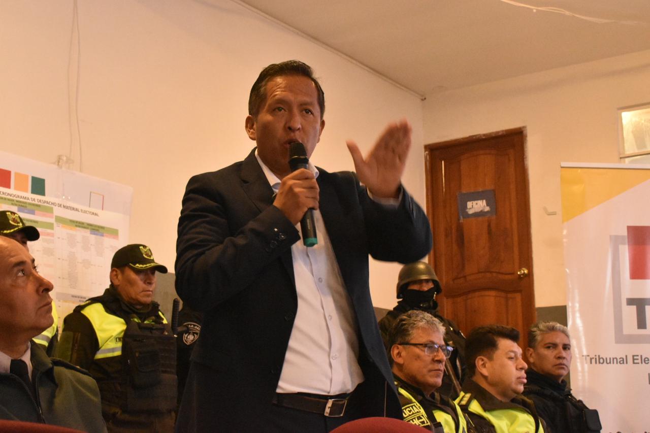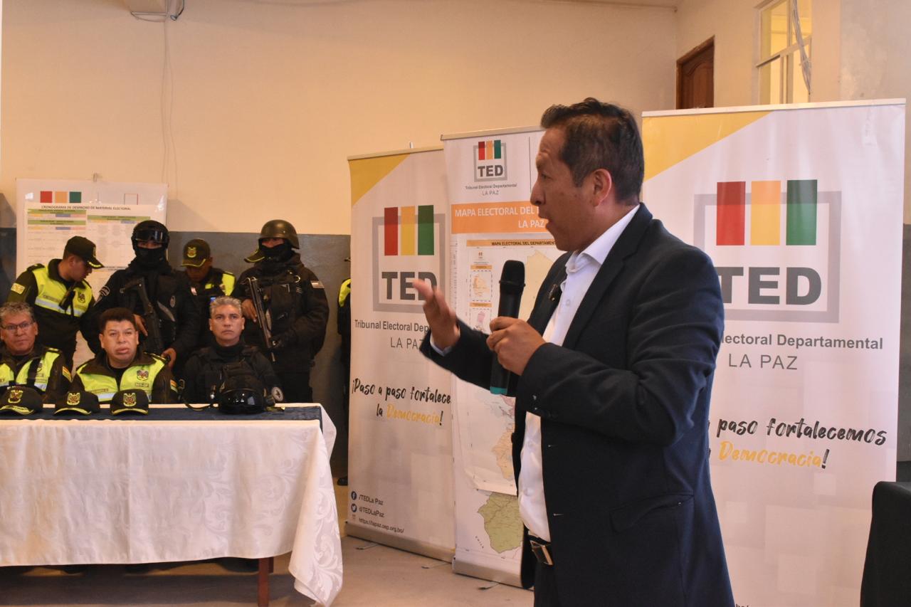 La actividad tuvo lugar en el Centro Departamental de Logística (CDL), en el marco de un taller dirigido a efectivos de la Policía Boliviana, de las Fuerzas Armadas, delegados de partidos políticos, observadores internacionales y medios de comunicación.