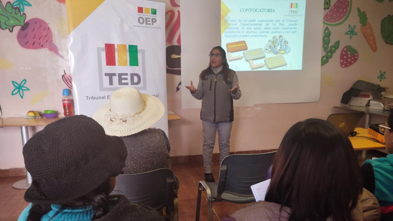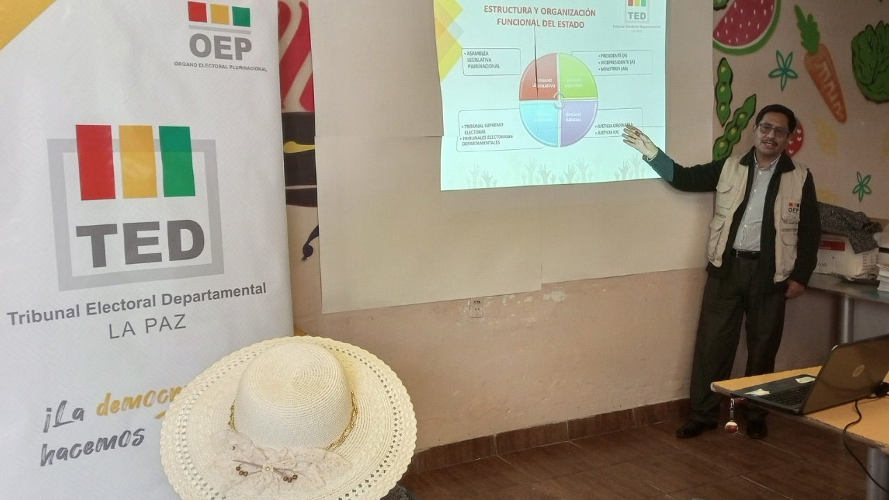 Privadas de libertad del Centro Penitenciario Femenino Miraflores fueron capacitadas por el Tribunal Electoral Departamental (TED) de La Paz en cinco temáticas: estructura del Estado Plurinacional, composición del Órgano Electoral Plurinacional, democracia intercultural, democracia paritaria y procedimientos electorales, este miércoles 7 de junio.