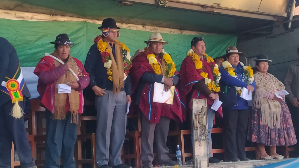Presidente del TED La Paz, Sabino Chávez junto a las autoridades locales del municipio de Achocalla.