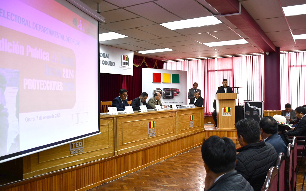 Durante la gestión 2024, el TED Oruro tuvo una ejecución presupuestaria de 1.549.388,73 bolivianos, lo que significa un 87,64 % del total asignado, que fue de 1.767.879 bolivianos, de acuerdo al Programa Operativo Anual (POA).