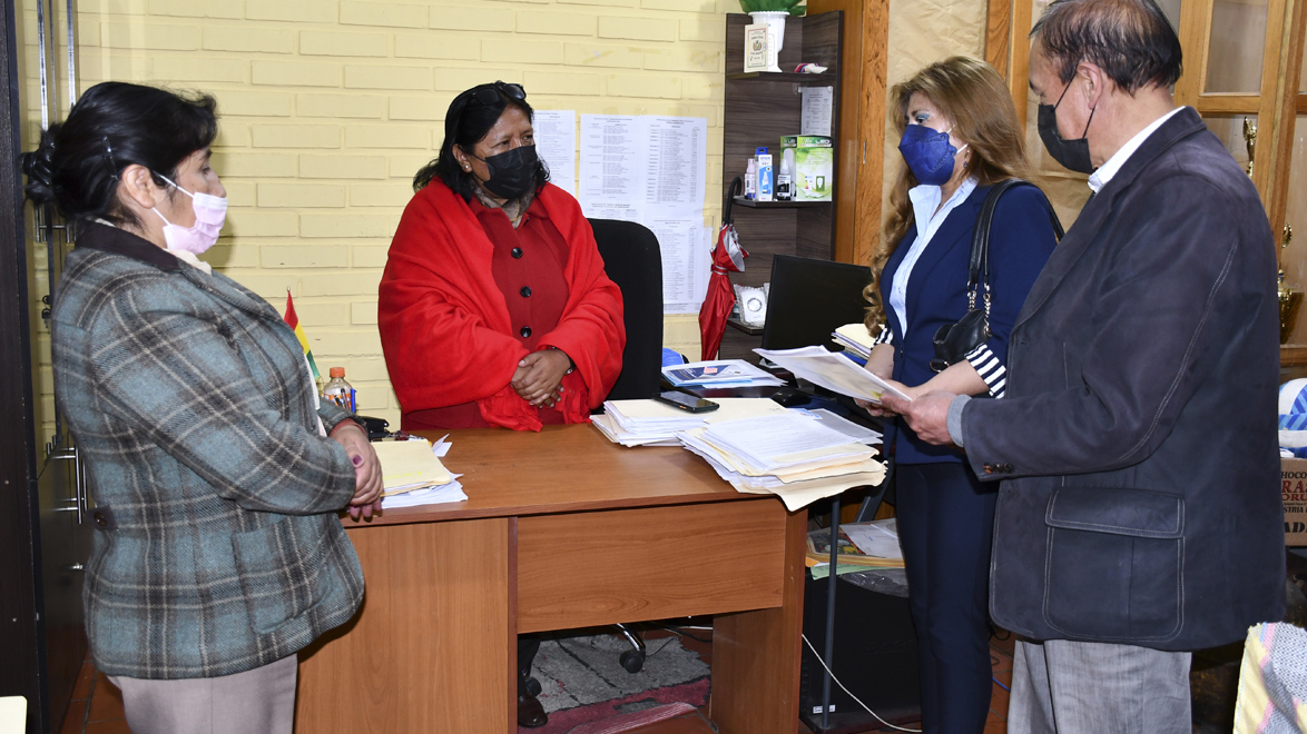 (De izq. a der) Vocal de TED Oruro, Amelia Gutiérrez, director de la unidad educativa Mariscal Sucre, Marcela Fulgera y la presidenta del TED Oruro, Zelma López.