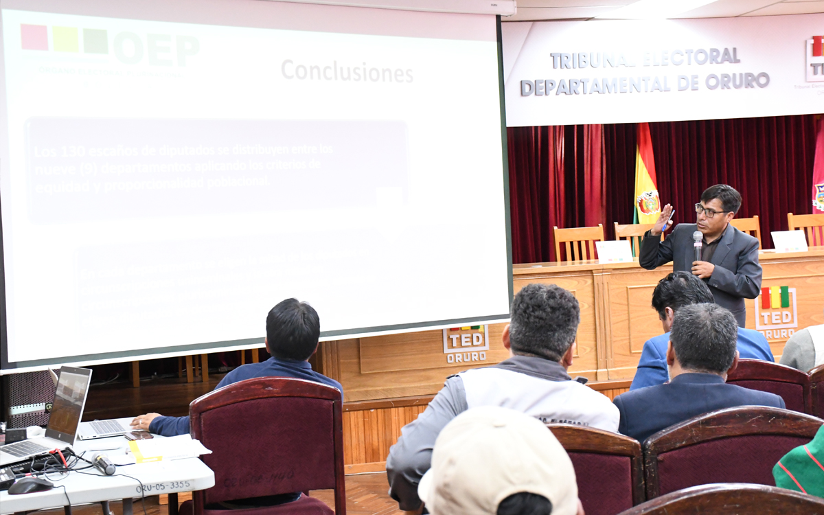El presidente del Tribunal Electoral Departamental (TED) de Oruro, Limber Arroyo, explicó que el departamento mantiene sus nueve escaños de diputados en la Asamblea Legislativa Plurinacional (ALP), de los cuales cuatro son uninominales, cuatro plurinominales y un especial de la Nación Uru, entre Chipaya y Murato.