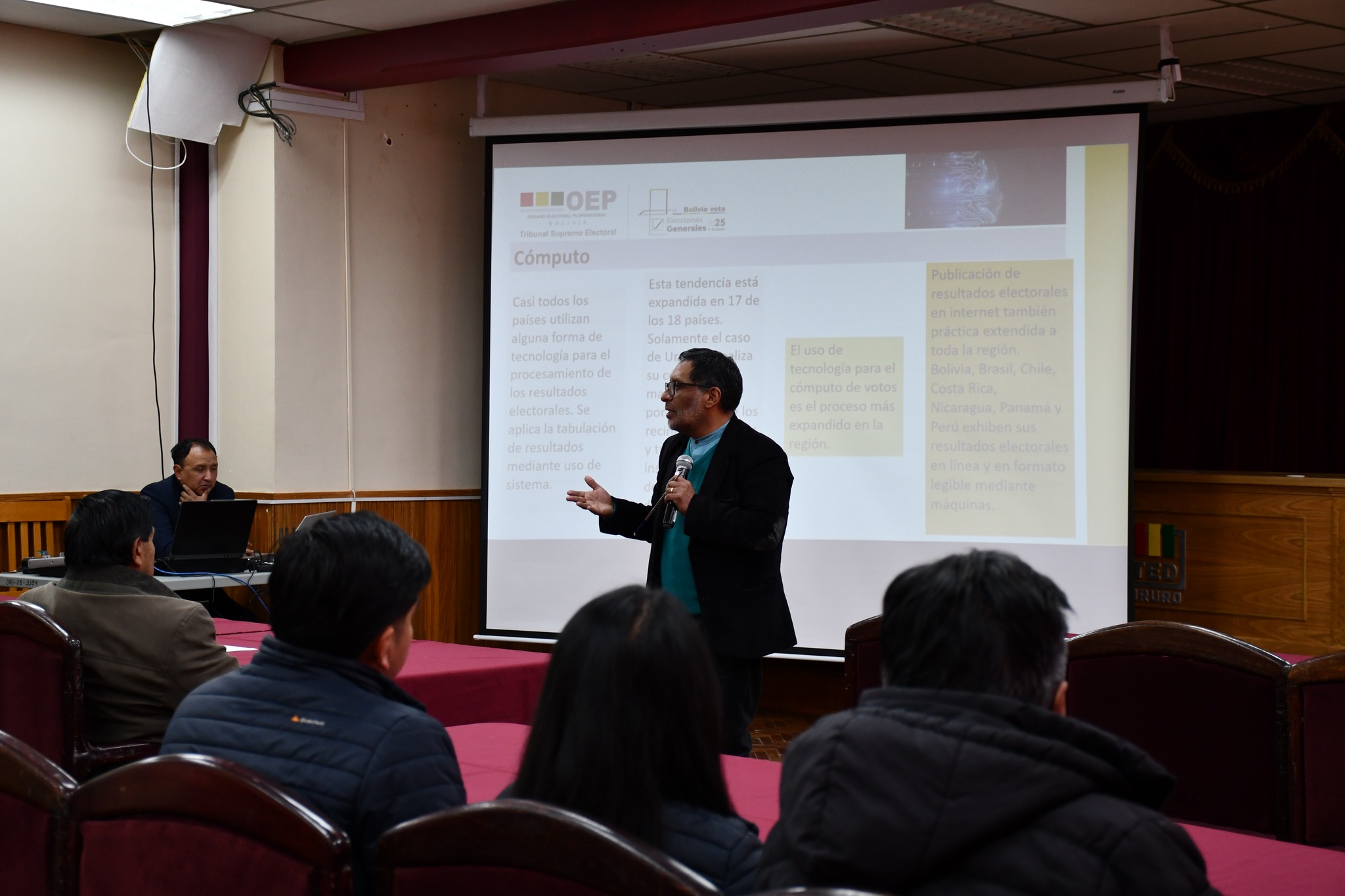 La última exposición estuvo a cargo del presidente del TED Oruro, Limber Arroyo, quien brindó una minuciosa explicación sobre la distribución de escaños y la delimitación de circunscripciones electorales.
