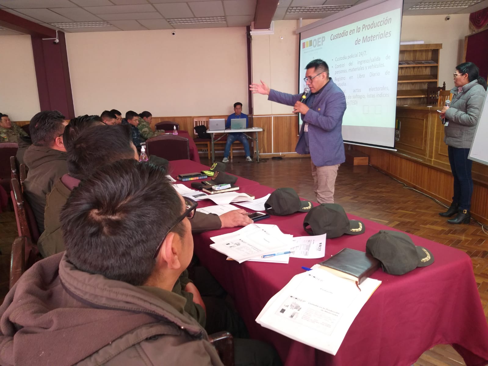 El taller se llevó a cabo en el auditorio del TED Oruro y contó con la participación de personal policial y militar, quienes recibieron información técnica detallada por parte de un especialista de la DNPE sobre la logística, responsabilidades y componentes de la cadena de custodia antes, durante y después de la jornada electoral.