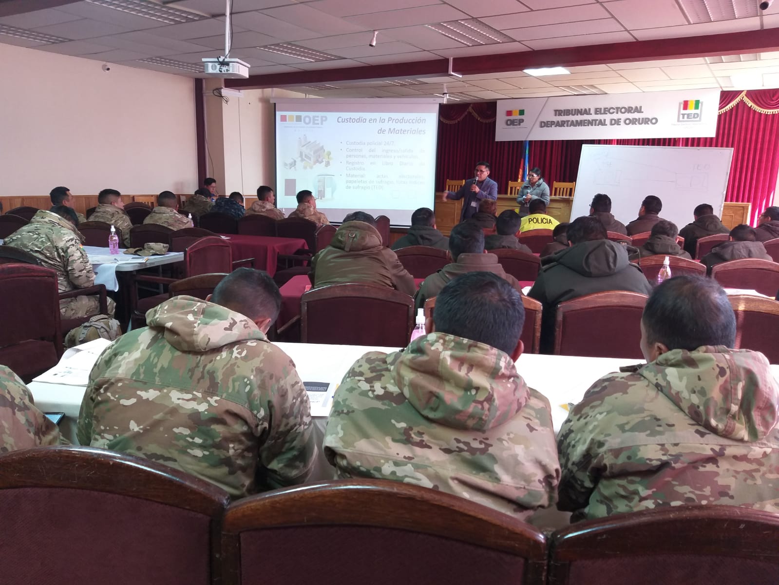 El Tribunal Electoral Departamental (TED) de Oruro, en coordinación con la Dirección Nacional de Procesos Electorales (DNPE), socializó este miércoles 2 de julio el protocolo logístico y operativo de la cadena de custodia del material electoral rumbo a las Elecciones Generales 2025. La actividad estuvo dirigida a efectivos del alto mando de la Segunda División del Ejército y del Comando Departamental de la Policía Boliviana.