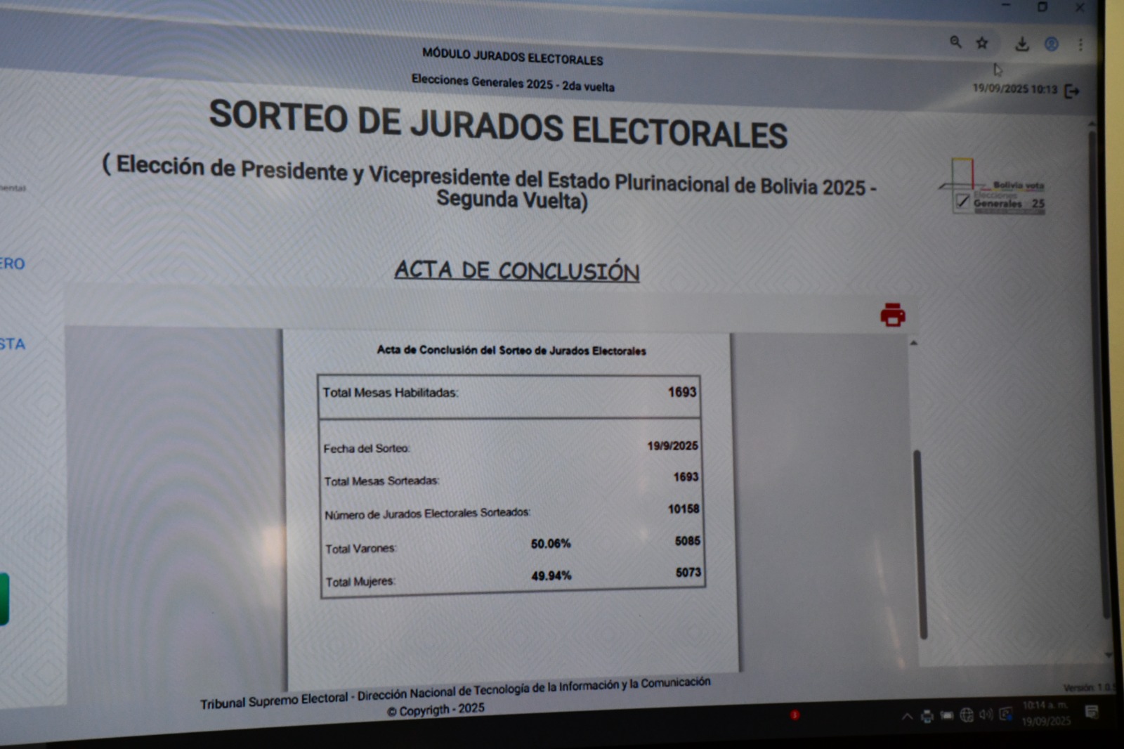 El Tribunal Electoral Departamental (TED) de Oruro sorteó este viernes 19 de septiembre a 10.158 ciudadanos para ejercer como jurados de mesa de sufragio de la segunda vuelta de las Elecciones Generales 2025, fijadas para el domingo 19 de octubre.