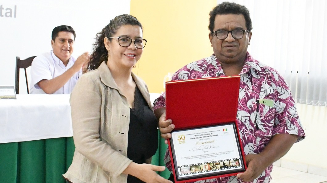 El punto más emotivo del acto fue el momento de la entrega de un reconocimiento por 30 años de servicio en el TED Pando a Wilman Velarde, quien dijo: “Es un honor recibir este reconocimiento por los 30 años de aporte a la democracia, han pasado diferentes colegiados, vocales por esta institución, desde que se ha abierto esta casa de la democracia, continuamente he estado aquí debido al trabajo y la entrega, la honestidad, la puntualidad, hasta el momento me encuentro trabajando en esta institución”, apuntó.