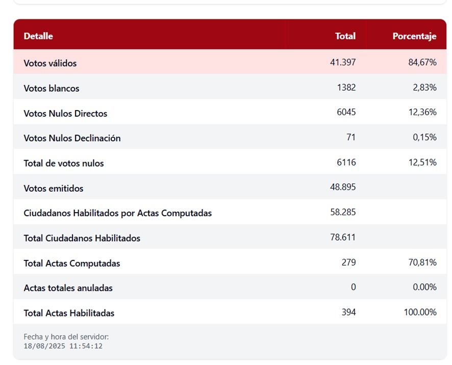 Según el Sistema de Consolidación Oficial de Resultados de Cómputo, el Tribunal Electoral Departamental (TED) de Pando alcanzó este lunes 18 de agosto, hasta el mediodía, más del 70 % de actas computadas.