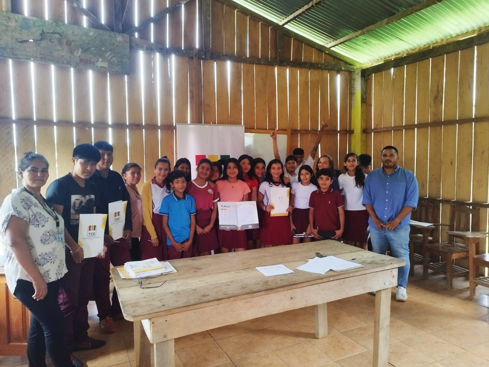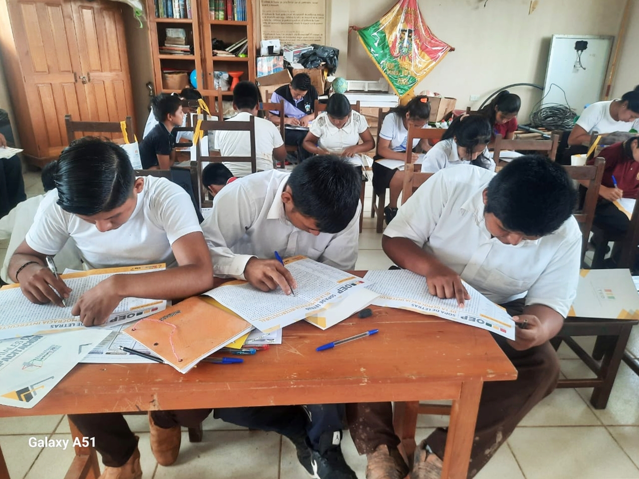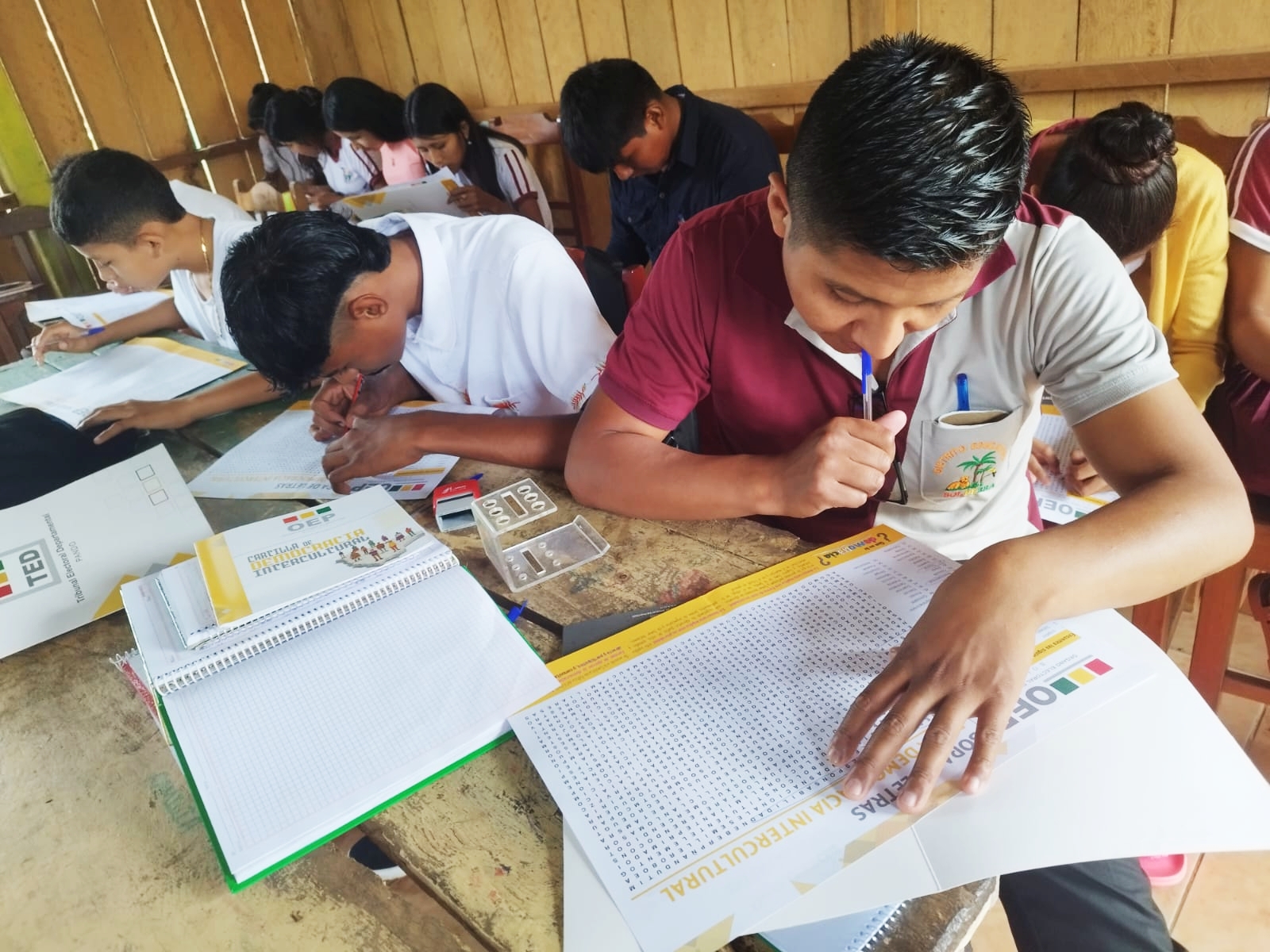 Durante las socializaciones las y los estudiantes accedieron a material didáctico de capacitación, finalizadas las actividades tanto estudiantes como maestros desarrollaron una dinámica evaluativa a través del llenado de una cartilla (sopa de letras) elaborada por el Sifde, que contiene 55 palabras relacionadas con la democracia intercultural.