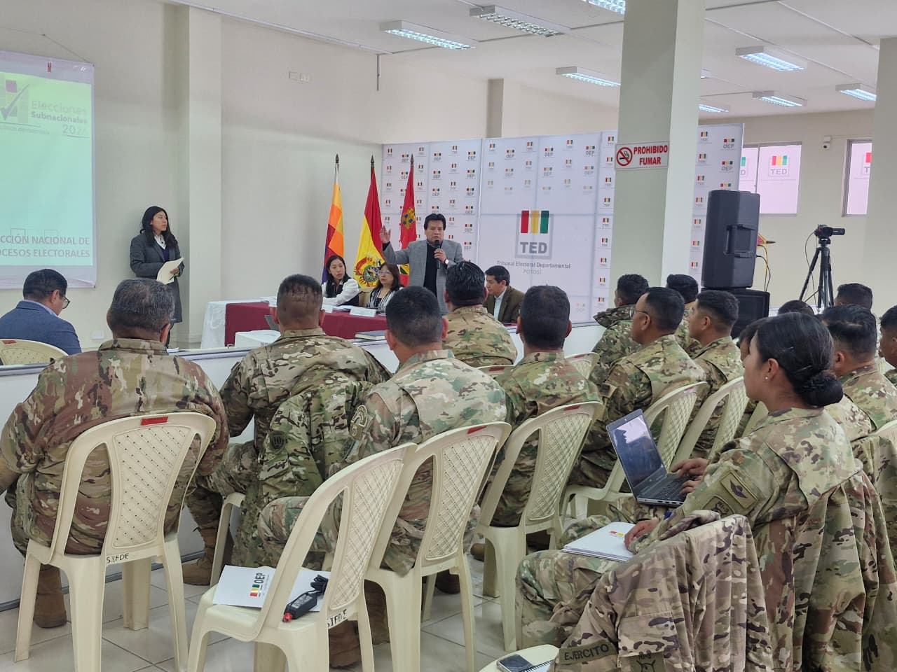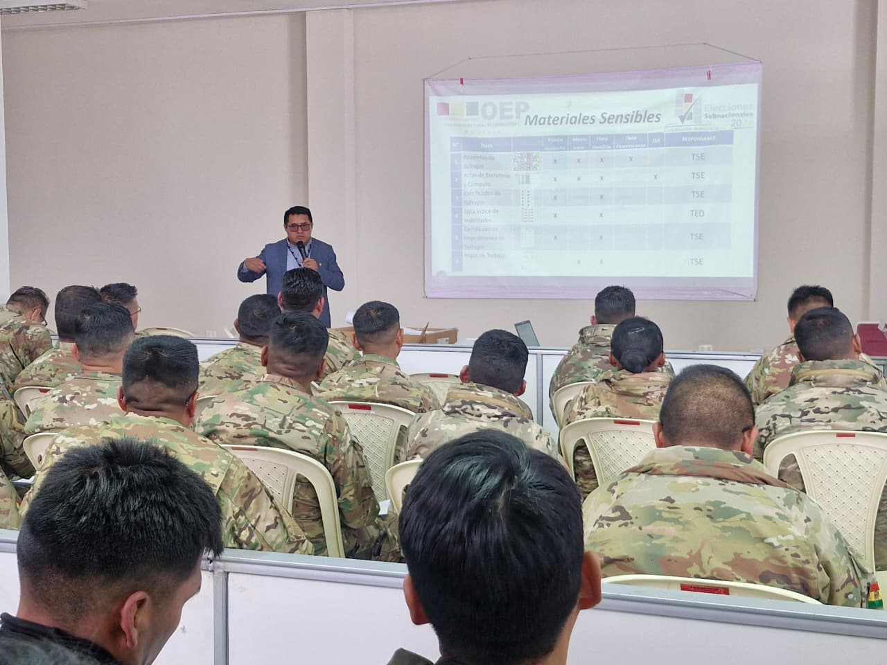 La capacitación estuvo dirigida a efectivos de la Policía Boliviana y de las Fuerzas Armadas, instituciones que cumplen un rol fundamental en la cadena de custodia del material electoral antes, durante y después de la jornada de votación, garantizando la integridad, seguridad y transparencia del proceso electoral.