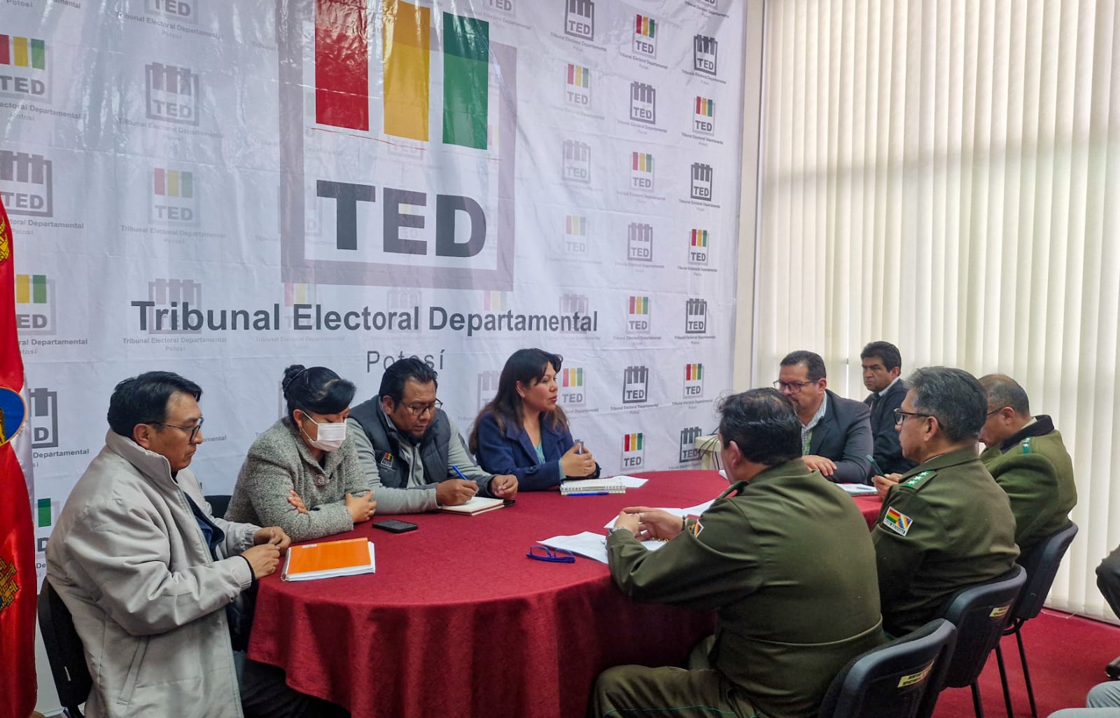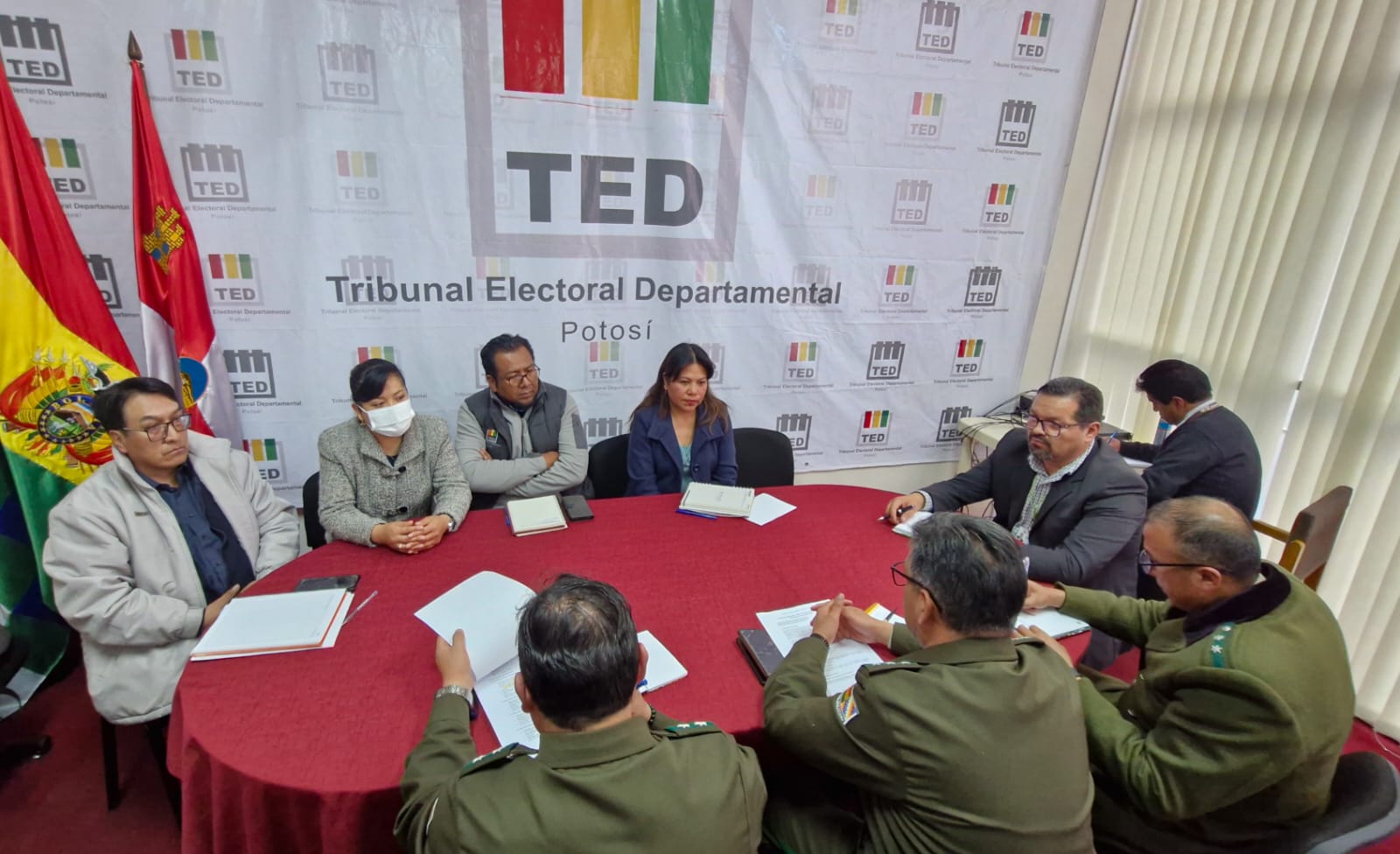 La reunión contó con la participación de la presidenta del TED Potosí, Rocío Mamani, el vicepresidente, Rolando García, la vocal Giovanna Coria y el vocal Jorge Arias, quienes, junto con las autoridades policiales y fiscales, abordaron las medidas destinadas a garantizar la tranquilidad y el orden en todo el departamento.