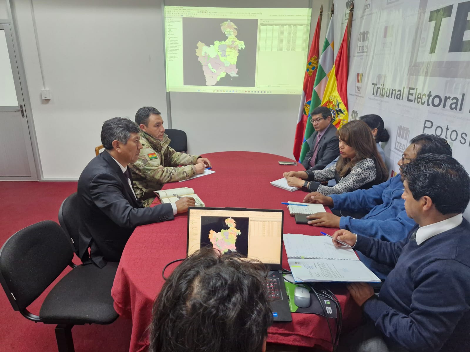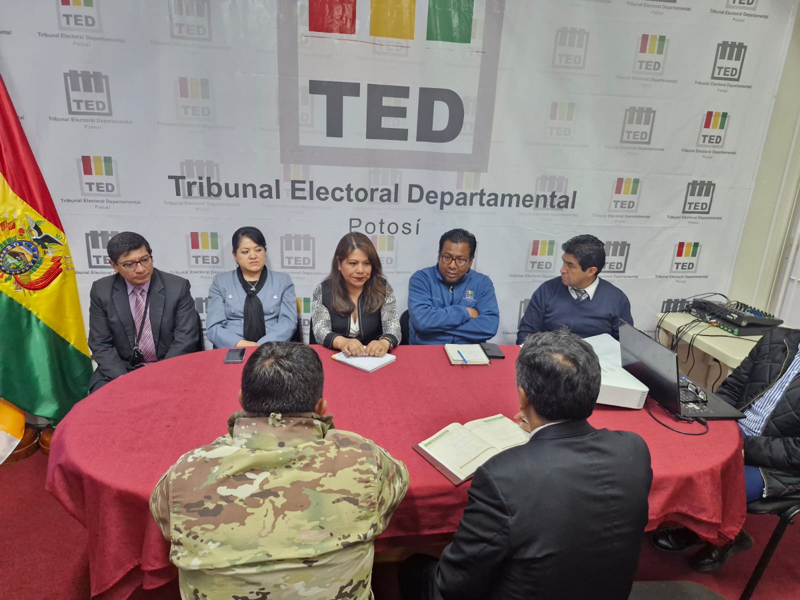 En cumplimiento del artículo 148 de la Ley 026 del Régimen Electoral, el TED Potosí coordina convenios interinstitucionales con las Fuerzas Armadas, a fin de garantizar la seguridad y custodia del material electoral en todas las etapas del proceso electoral, mediante el despliegue de efectivos militares en todo el departamento.