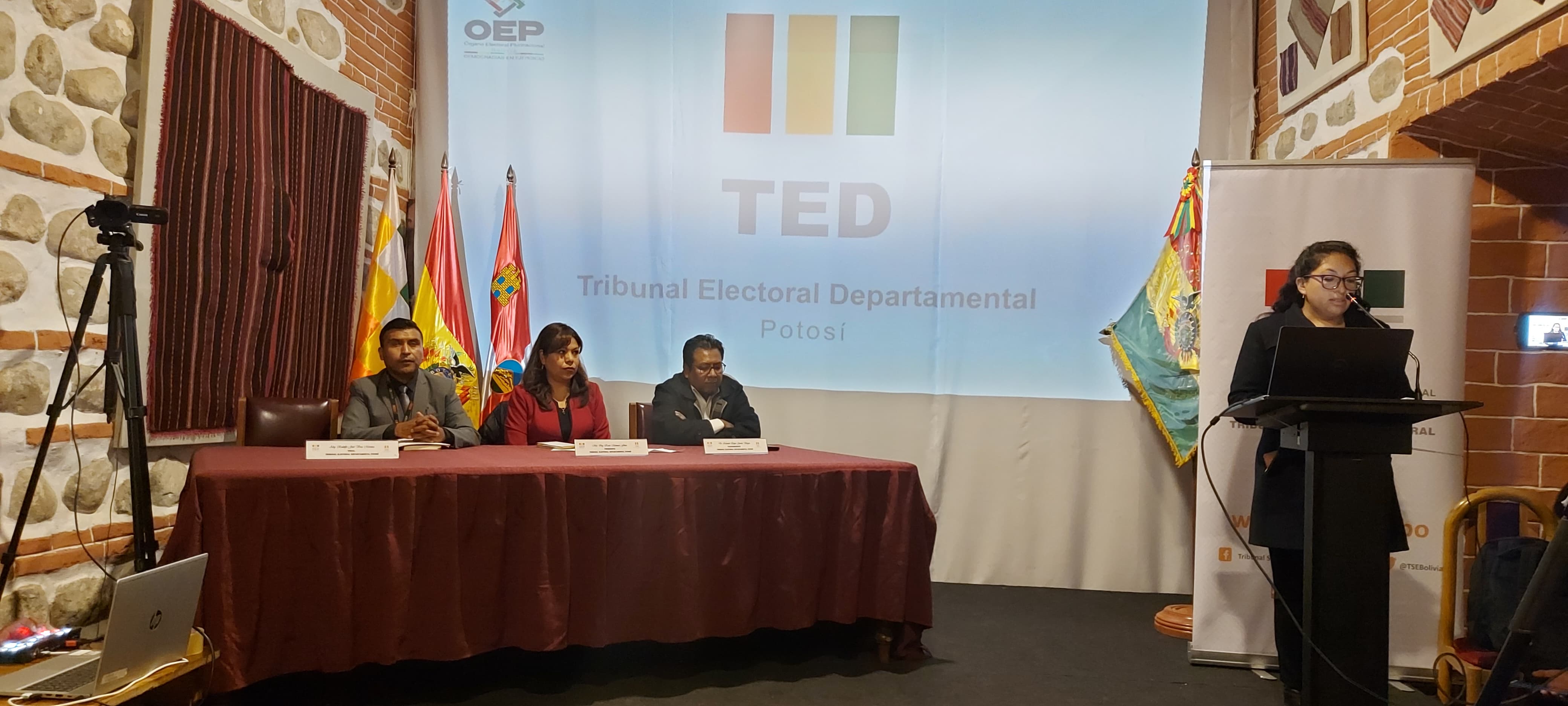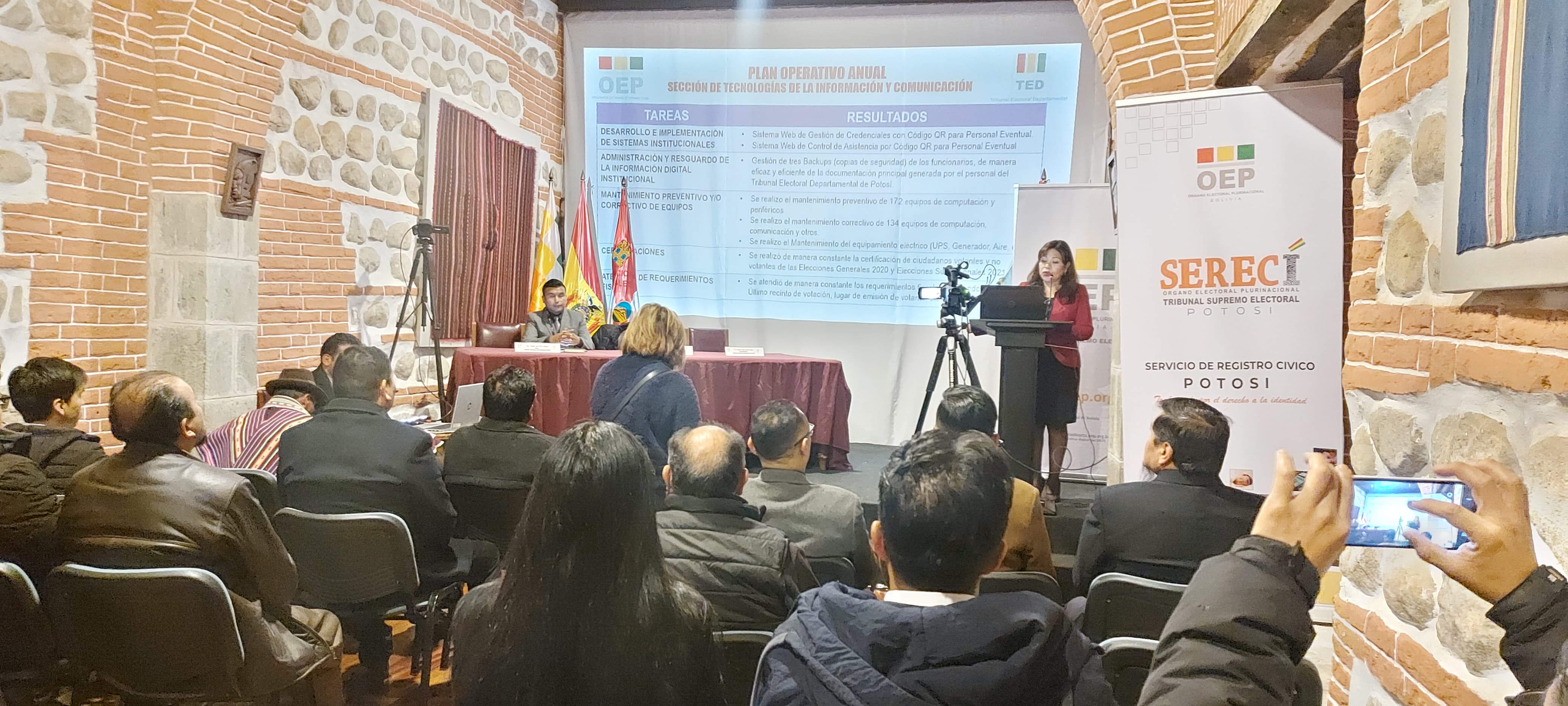 La presidenta, se brindó datos del proceso electoral del cual se hizo mención que el TED Potosí contó con 150.000 trípticos impresos, 50.000 afiches calendario y 100.000 separatas, todo esto referente al proceso electoral que se encaró en el mes de diciembre, así también se capacitó a 11.361 jurados electorales de las siete circunscripciones, 799 notarios, 99 coordinadores de ruta, 34 digitalizadores, 70 servidores públicos de planta y eventuales, 600 efectivos policiales y militares, 19 organizaciones de naciones y pueblos indígena originario campesinos y se contó con 11 puntos de información y socialización.