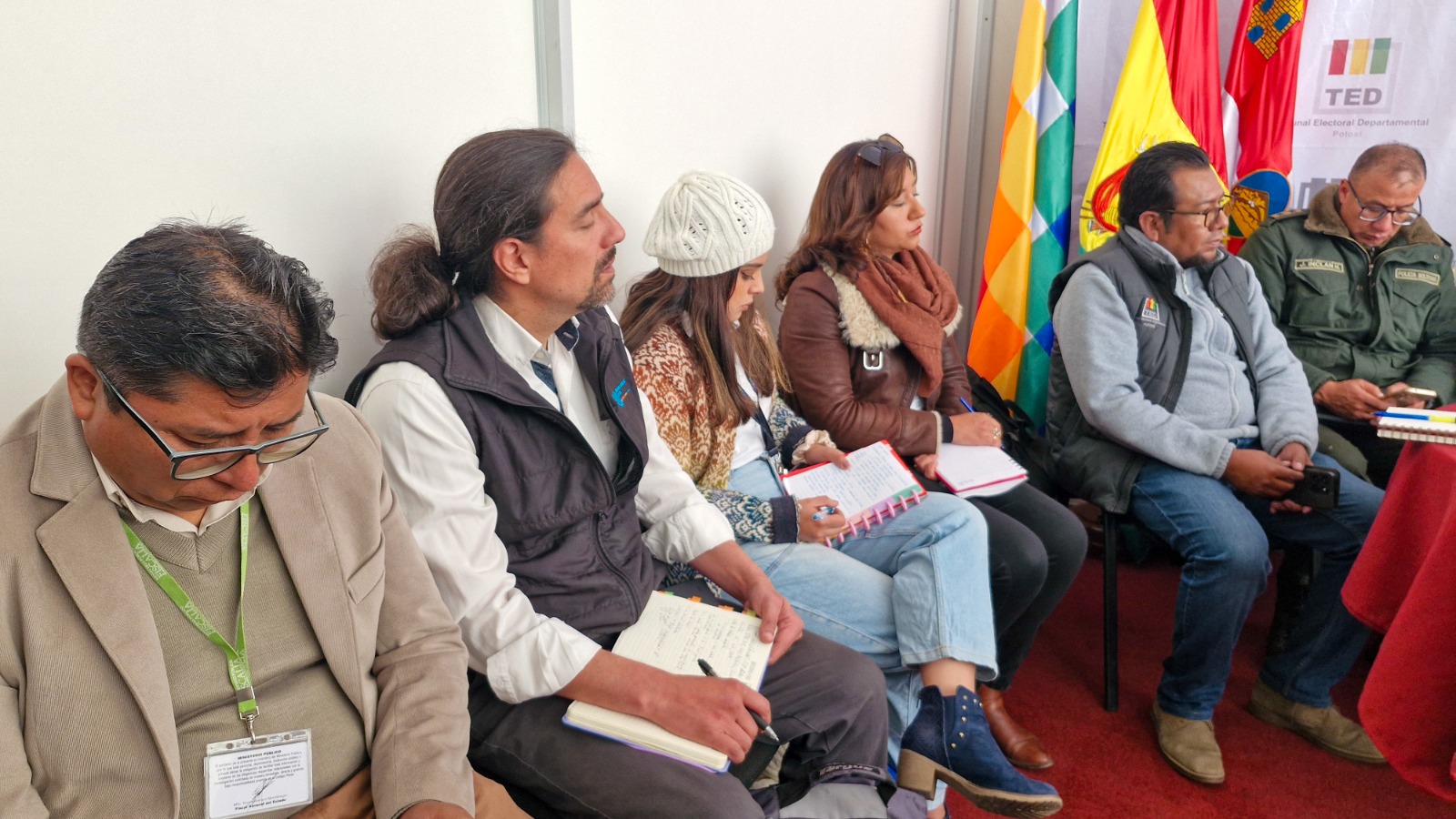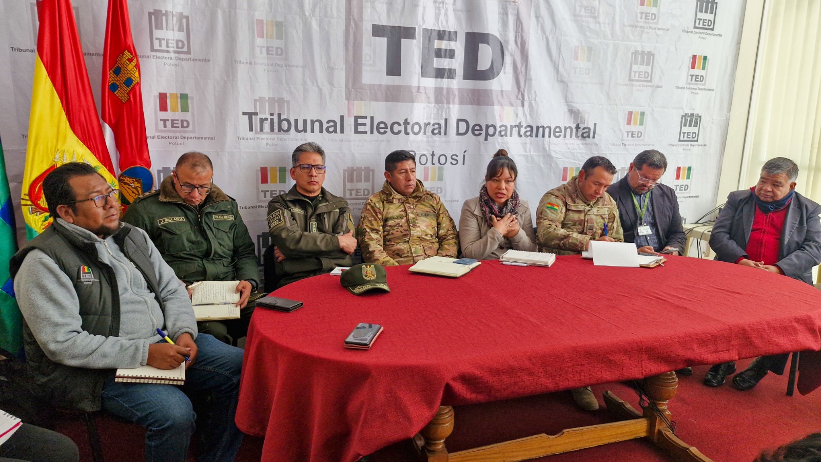 La reunión fue presidida por la presidenta del TED Potosí, Rocío Mamani, y el vicepresidente, Rolando García, quienes informaron sobre el trabajo desarrollado hasta la fecha, los avances alcanzados y la coordinación establecida con las distintas instituciones para garantizar el normal desarrollo de la jornada electoral. También destacaron la capacitación de jurados electorales, el traslado del material electoral y la preparación de las unidades de apoyo que estarán presentes el día de la votación.