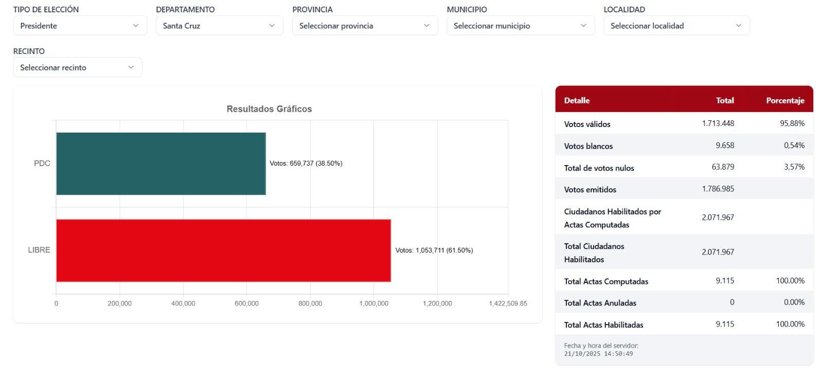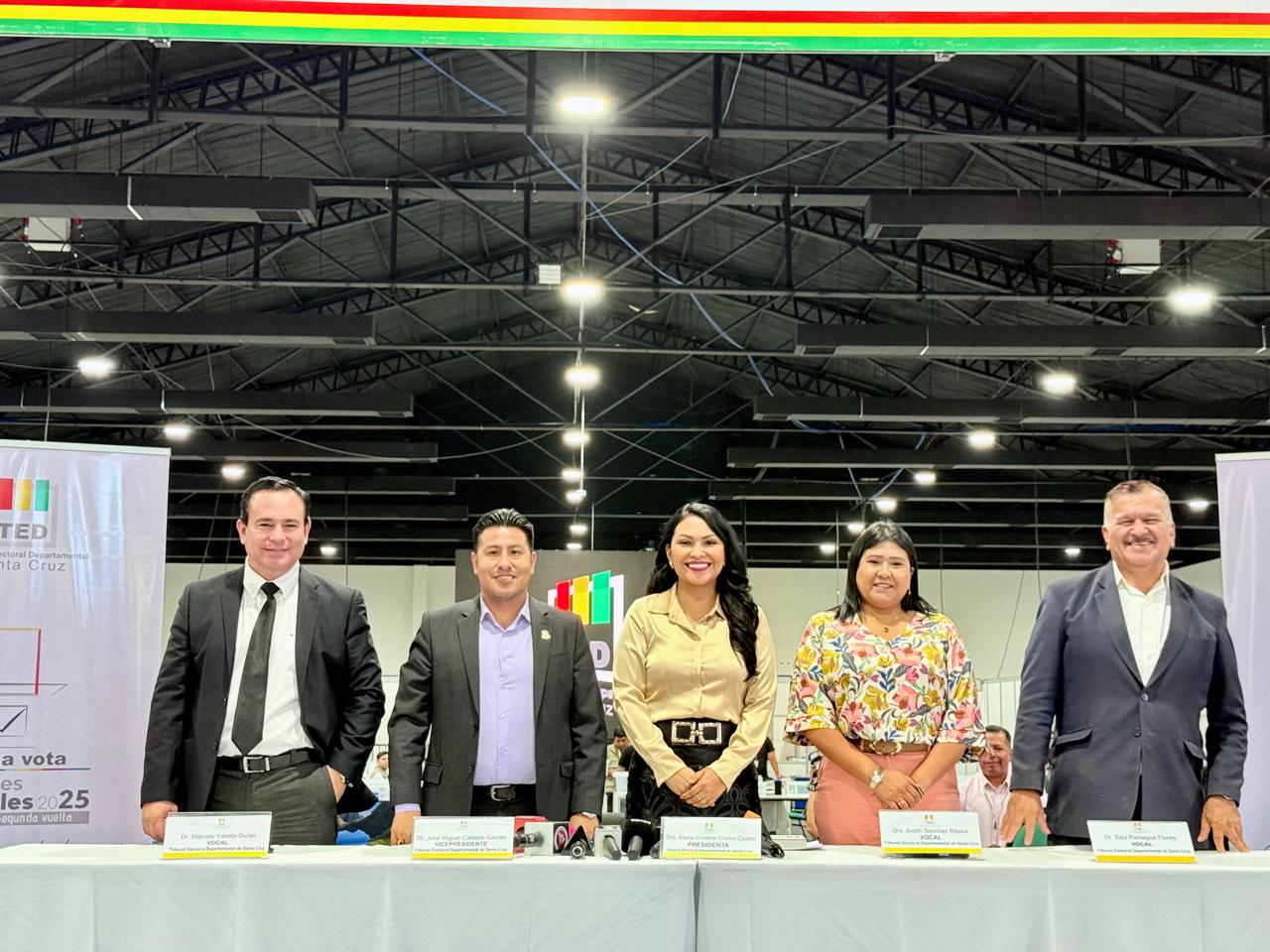 Este martes 21 de octubre, a las 13:30, la Sala Plena del Tribunal Electoral Departamental (TED) de Santa Cruz concluyó oficialmente el cómputo departamental al haber alcanzado el 100 % de las actas electorales procesadas.