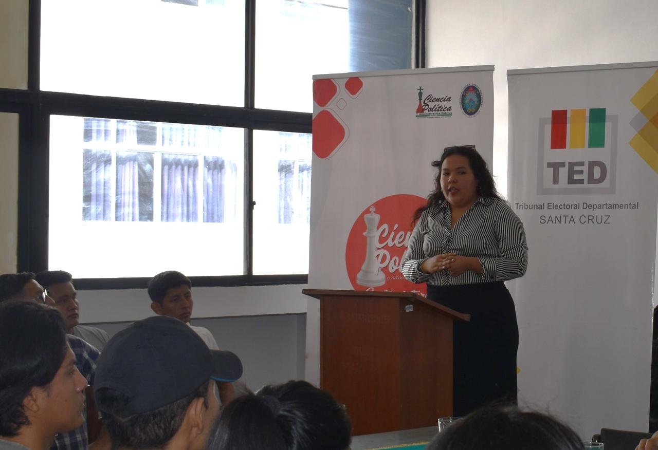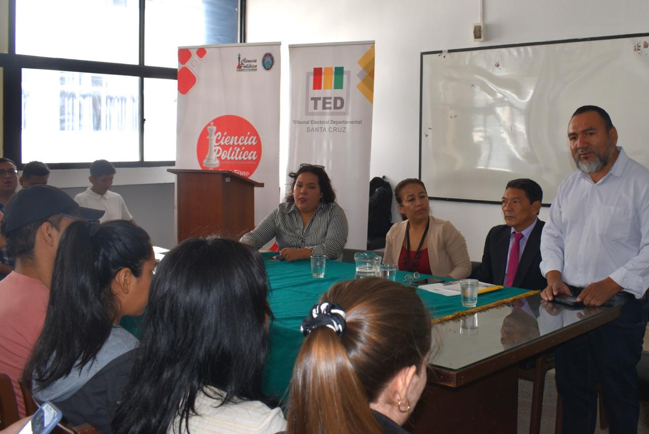 El Tribunal Electoral Departamental (TED) de Santa Cruz a través del Servicio Intercultural de Fortalecimiento Democrático (SIFDE) desarrolla el ciclo de talleres presenciales sobre la función electoral en Bolivia y estructura del Órgano Electoral Plurinacional (OEP), dirigido a estudiantes de la carrera de Ciencias Políticas y Administración Pública de la Universidad Autónoma Gabriel René Moreno (UAGRM), como parte del proyecto de fortalecimiento de la democracia intercultural en la educación superior y sistema universitario.