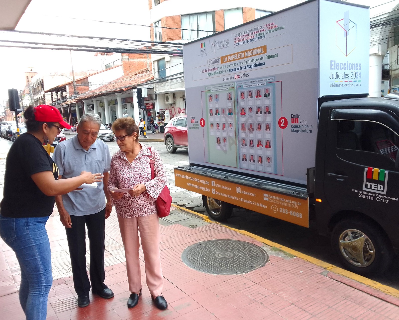 El Tribunal Electoral Departamental (TED) de Santa Cruz, a través del Servicio Intercultural de Fortalecimiento Democrático (Sifde), desplegó puntos de información móvil y un equipo de personal que se encargará de socializar y difundir materiales sobre las Elecciones Judiciales 2024 y la aplicación Yo Participo en diferentes puntos la capital.