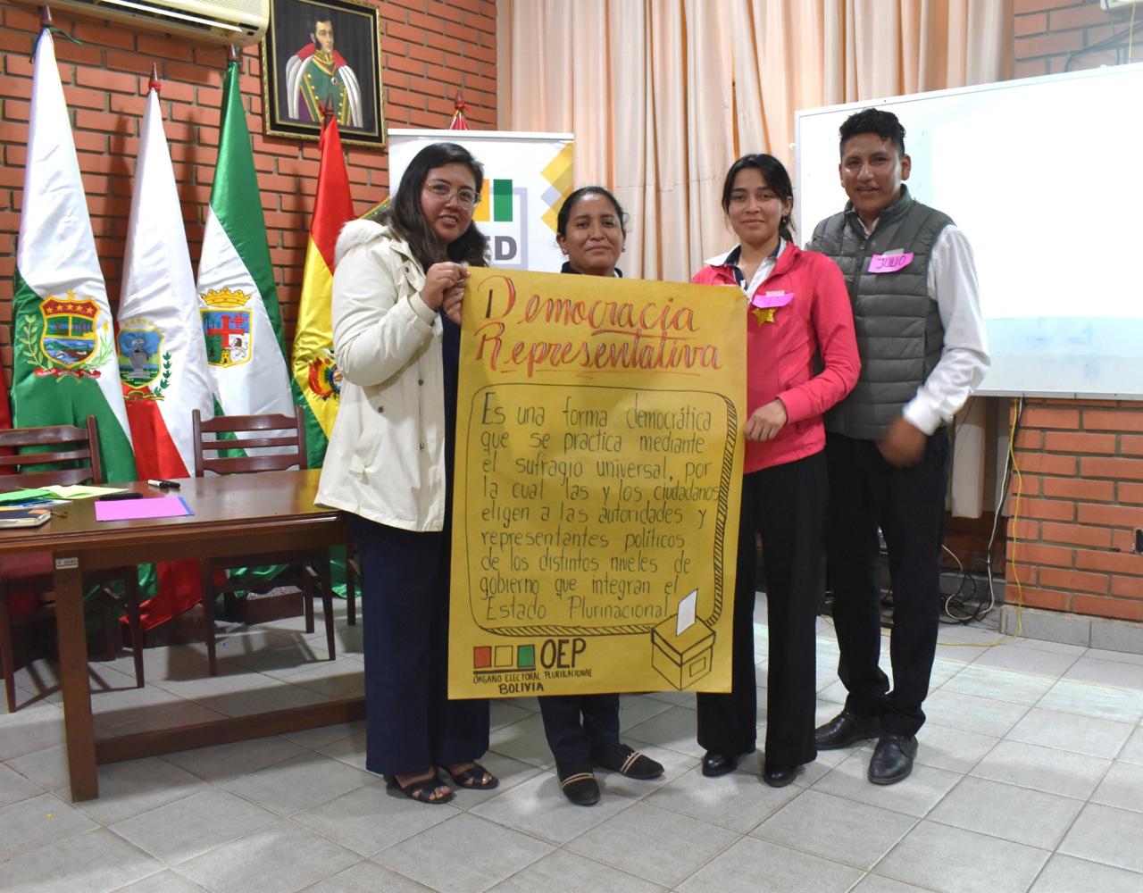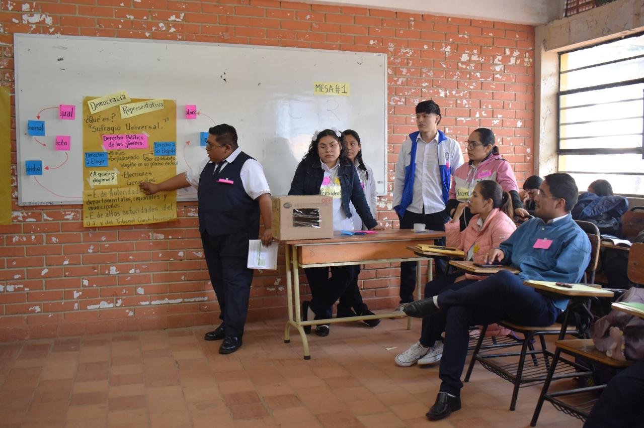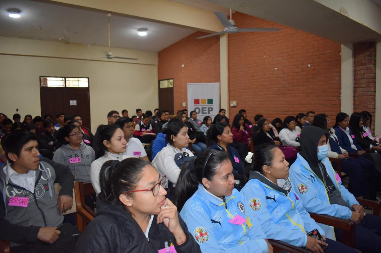 Esta actividad es parte complementaria del curso de educación virtual que se desarrolla a través de la plataforma Demodiversidad del Órgano Electoral Plurinacional (OEP), en el marco del convenio de cooperación interinstitucional entre el Tribunal Supremo Electoral y el Ministerio de Educación. Actualmente todas las y los estudiantes de último año de las ESFM del departamento son parte de este curso.