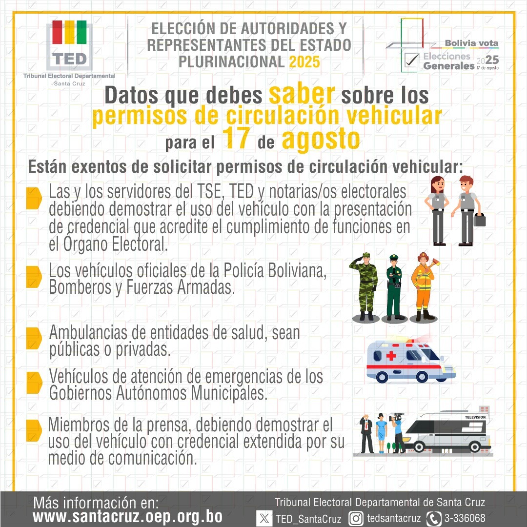 El vicepresidente del TED Santa Cruz, José Miguel Callejas, aclaró que el personal médico, ambulancias, efectivos de las Fuerzas Armadas, Policía Boliviana y medios de comunicación podrán circular el día de la elección portando únicamente su credencial institucional, sin necesidad de gestionar un pase adicional.