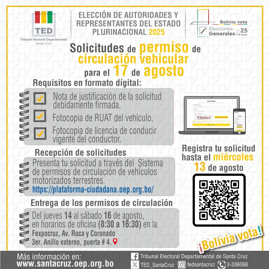 “Del jueves 14 al sábado 16 de agosto, en horario de oficina en instalaciones de la Fexpocruz, se entregarán de los permisos de circulación. Cada solicitud será evaluada según su justificación, priorizando casos de emergencia médica, atenciones programadas u otras situaciones que requieran trato preferente”, indicó Callejas.