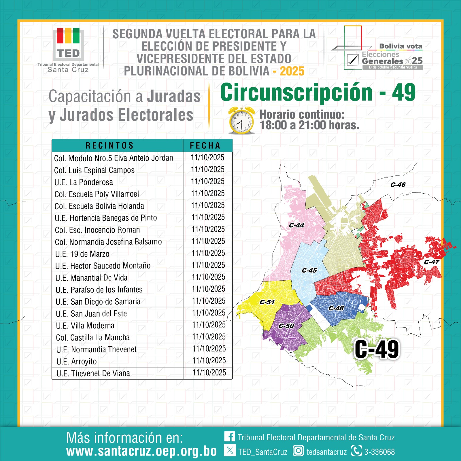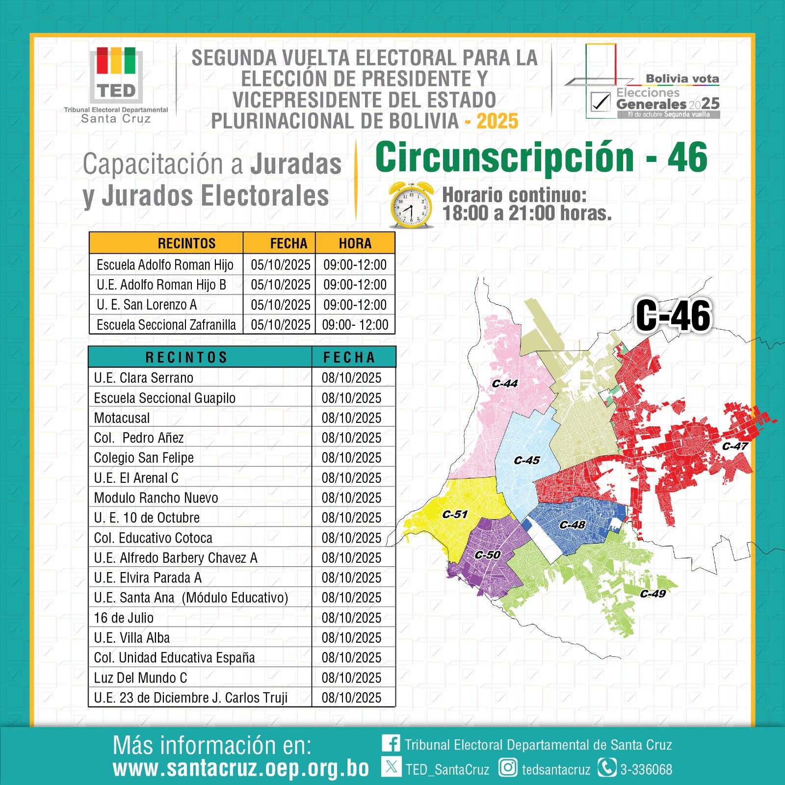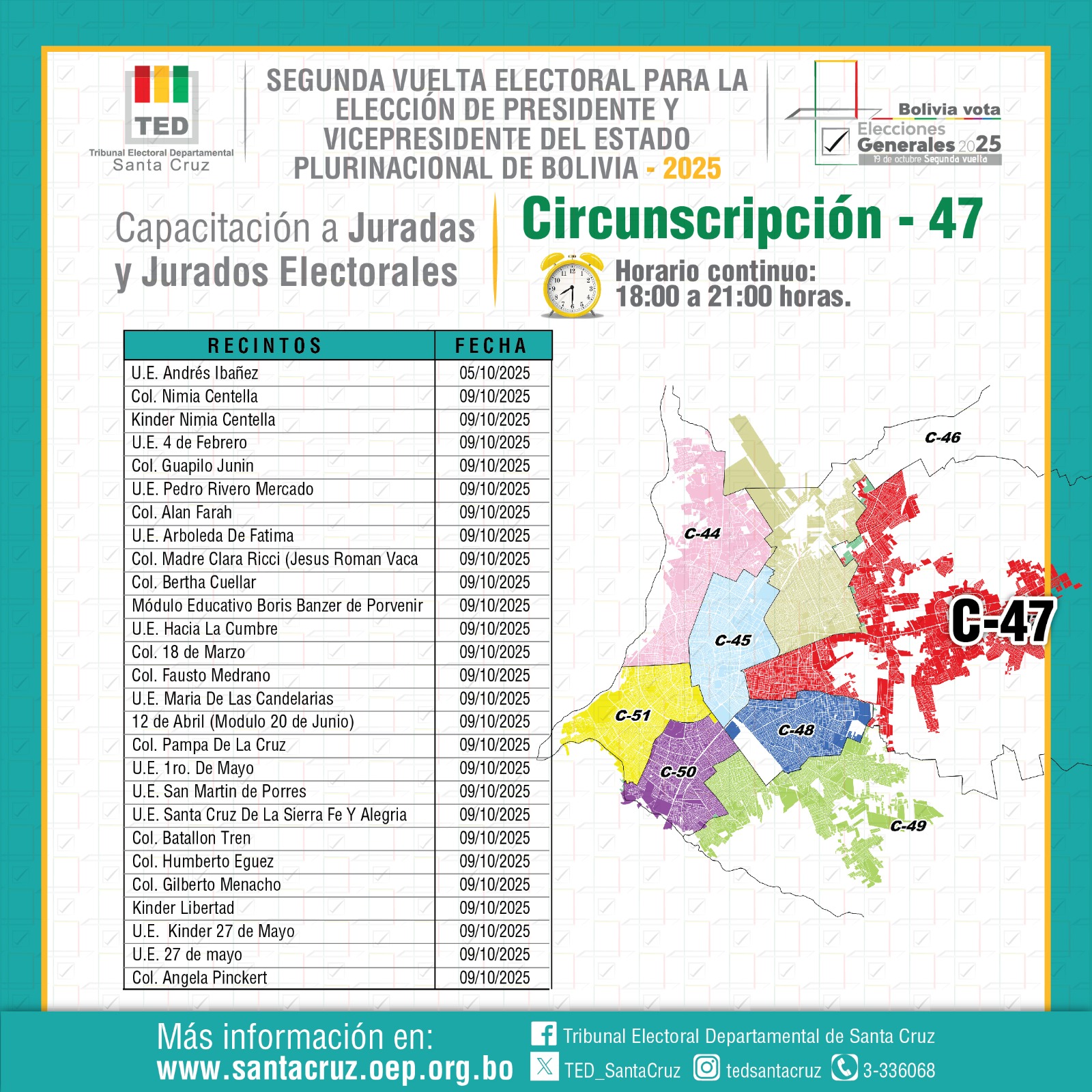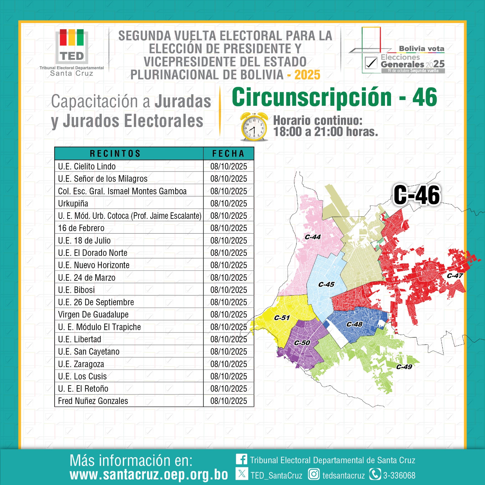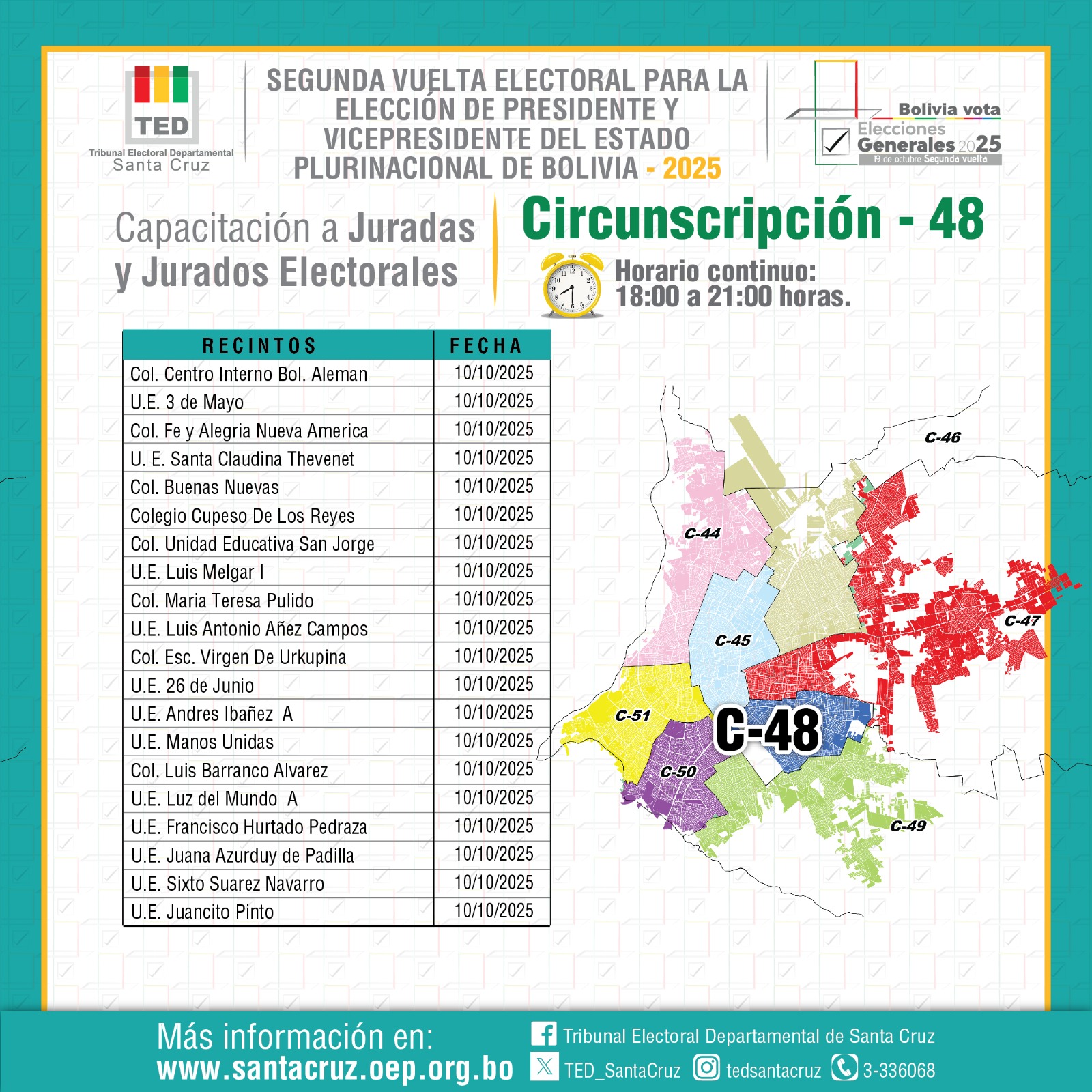 Las personas seleccionadas pueden consultar el portal web del TED Santa Cruz y sus redes sociales oficiales para conocer el cronograma, puntos y horarios de capacitación: https://santacruz.oep.org.bo/