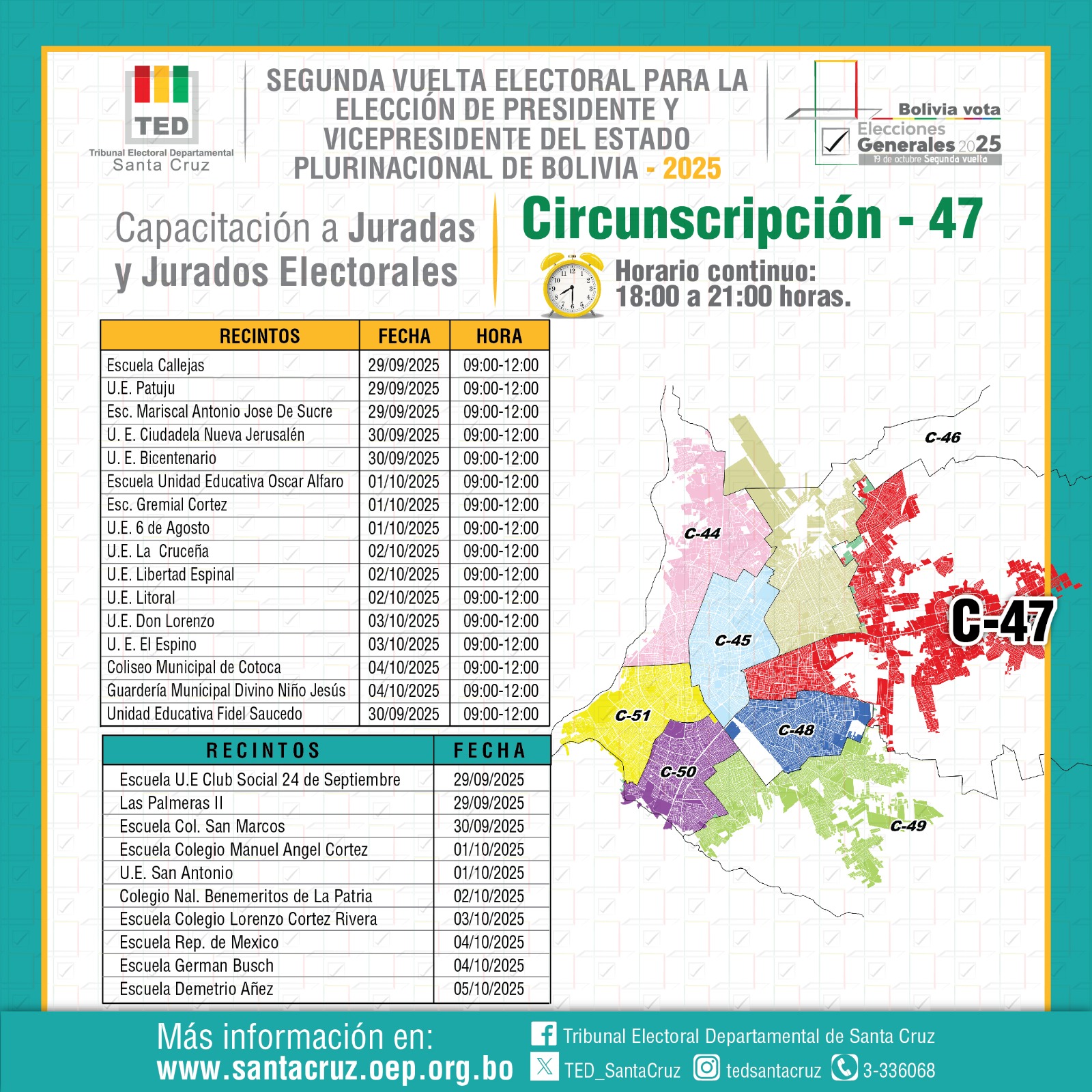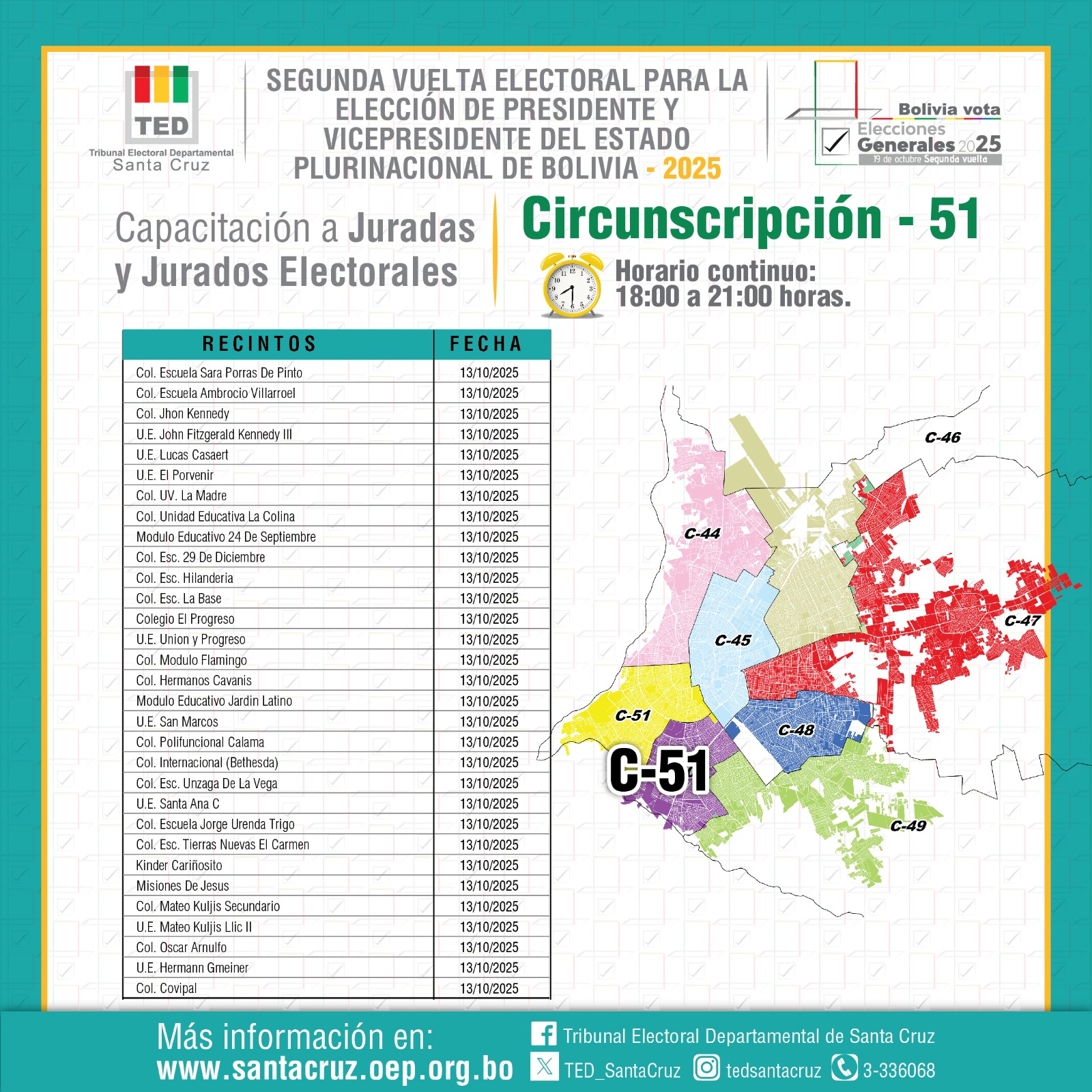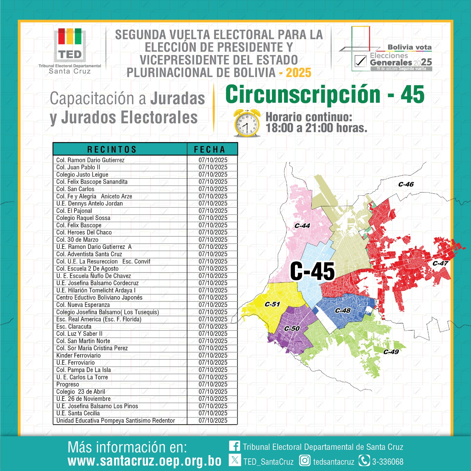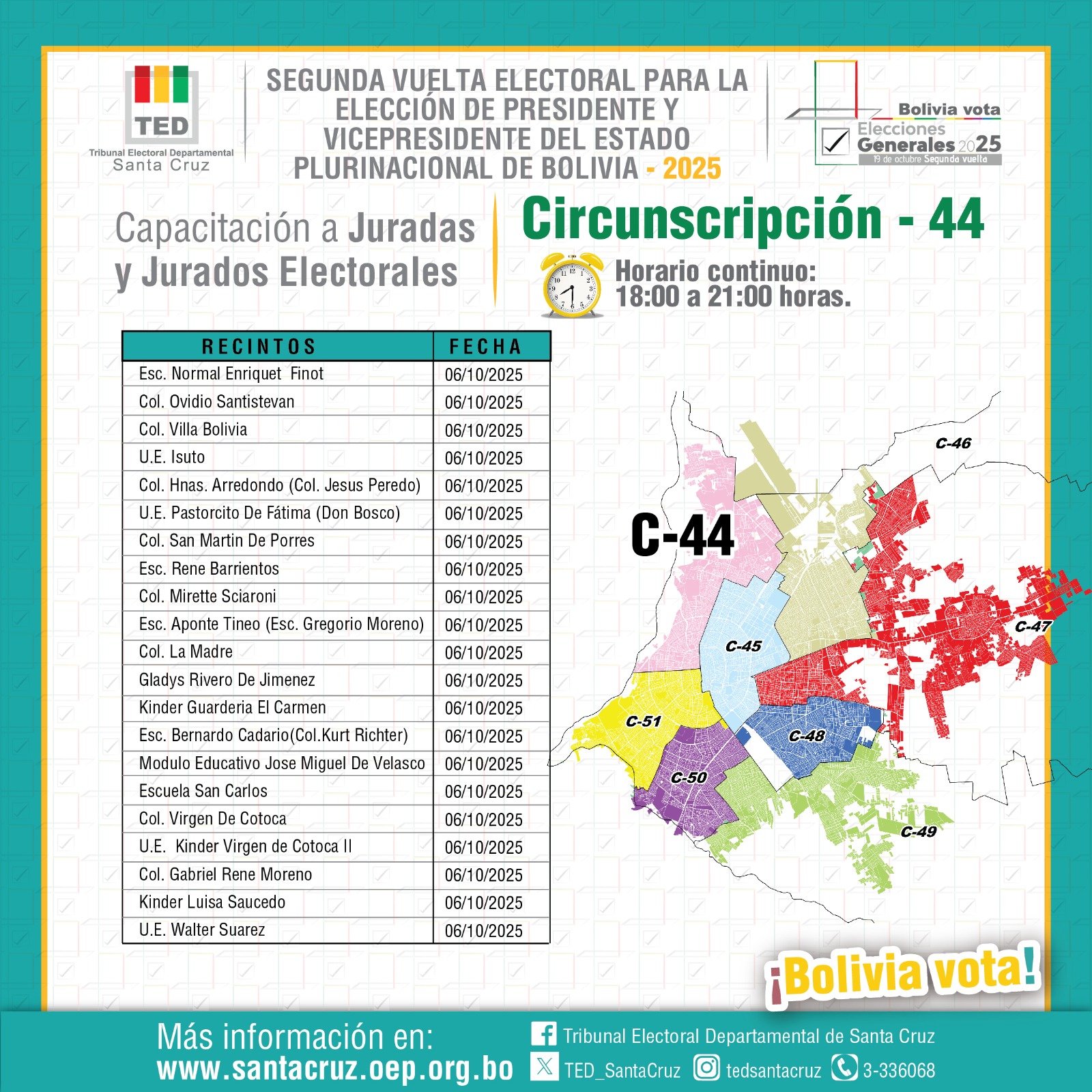 Las personas seleccionadas pueden consultar el portal web del TED Santa Cruz y sus redes sociales oficiales para conocer el cronograma, puntos y horarios de capacitación: https://santacruz.oep.org.bo/