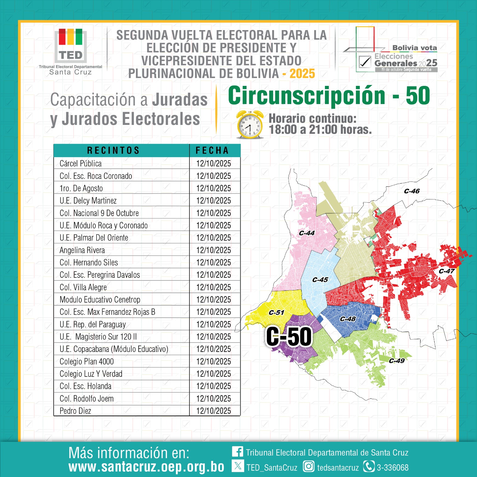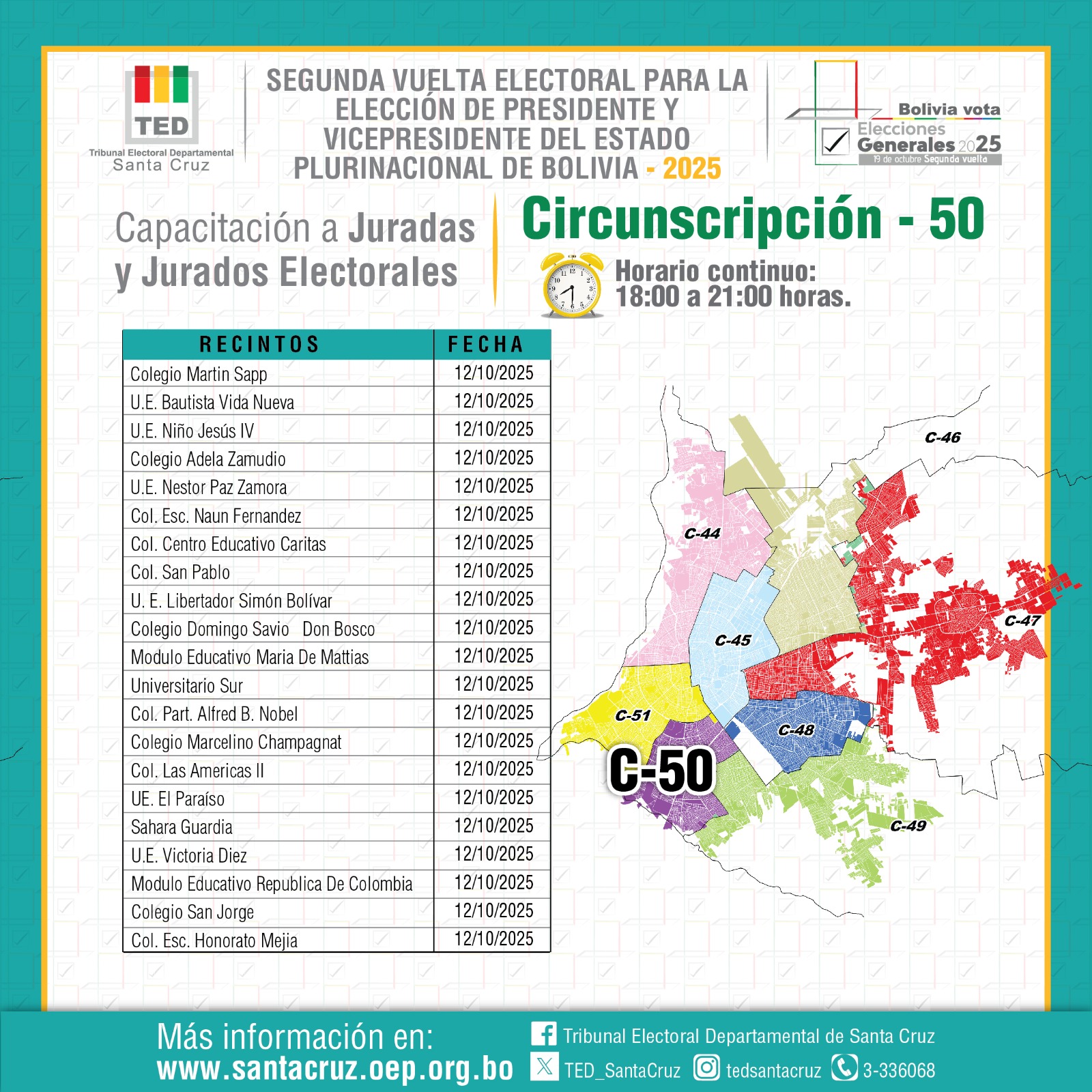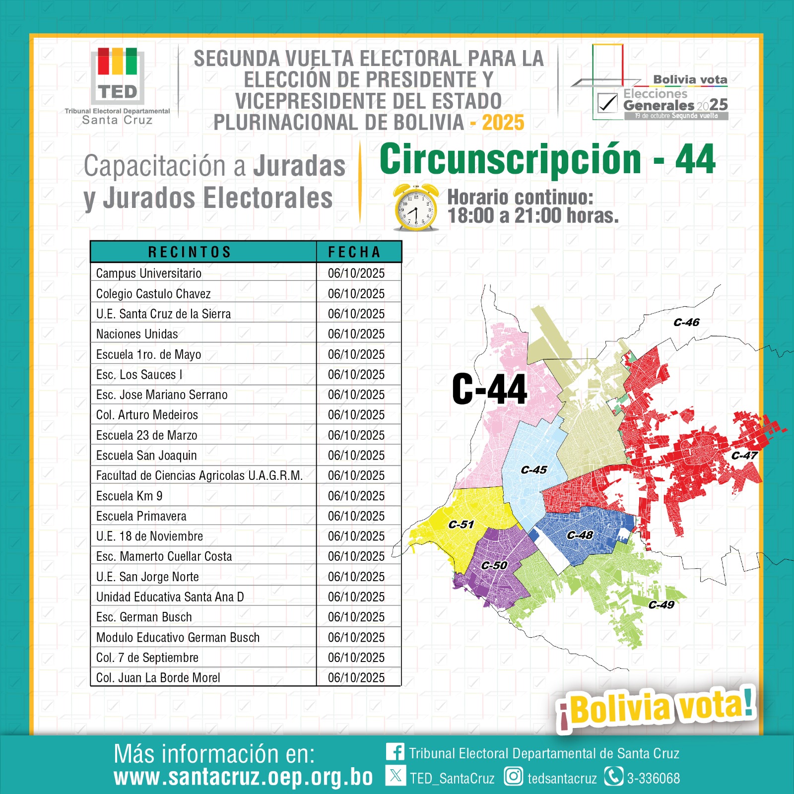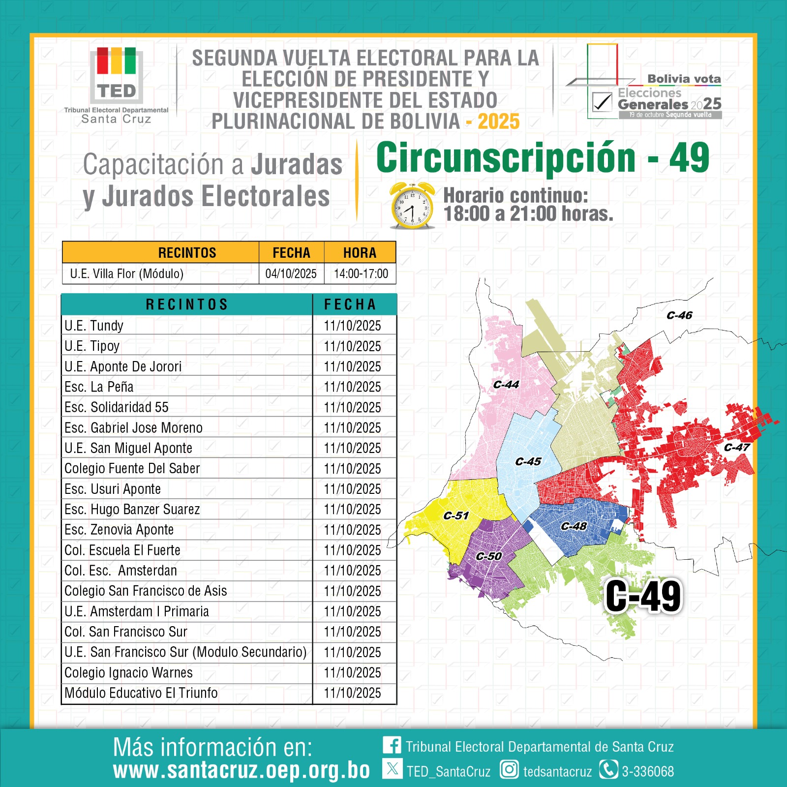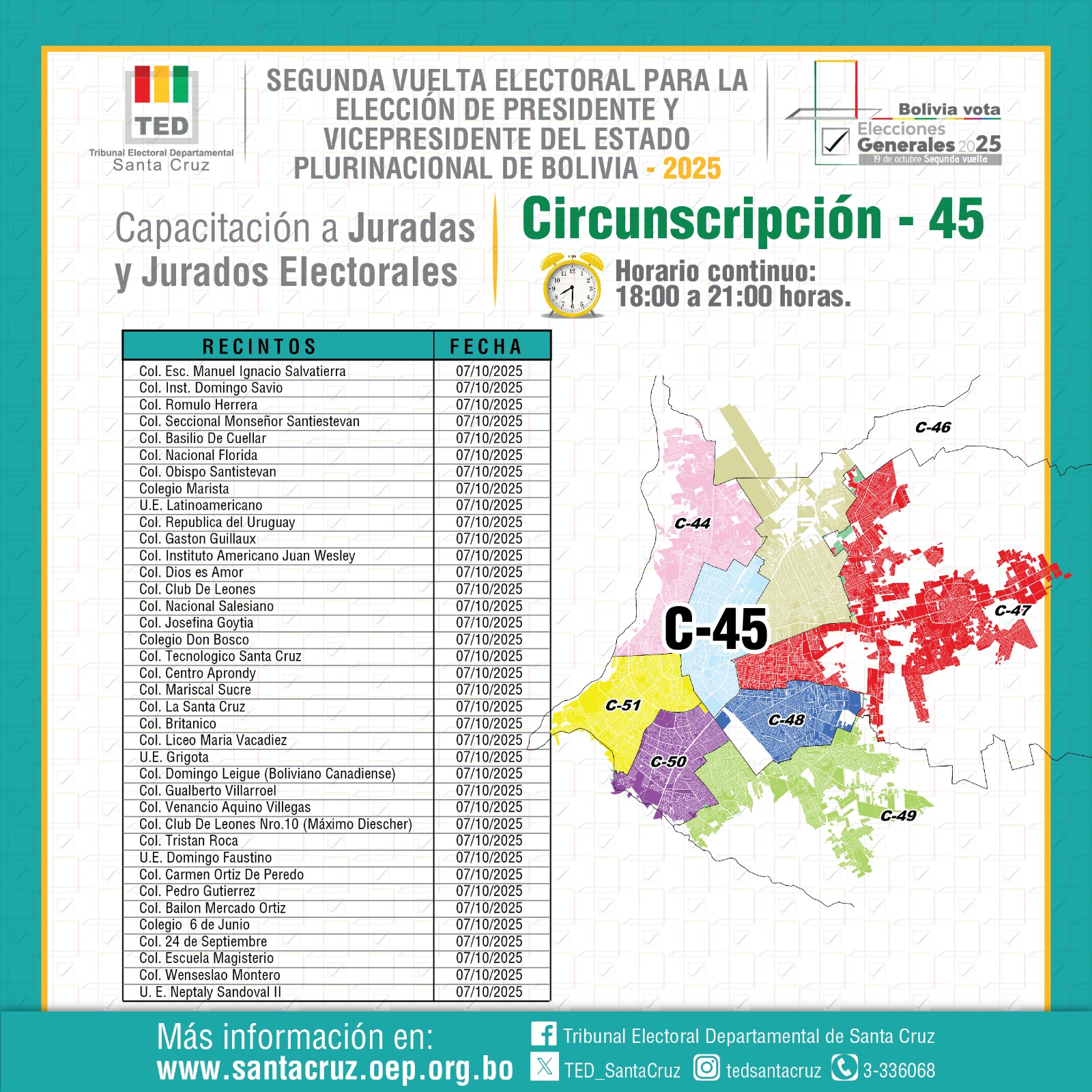 Las personas seleccionadas pueden consultar el portal web del TED Santa Cruz y sus redes sociales oficiales para conocer el cronograma, puntos y horarios de capacitación: https://santacruz.oep.org.bo/
