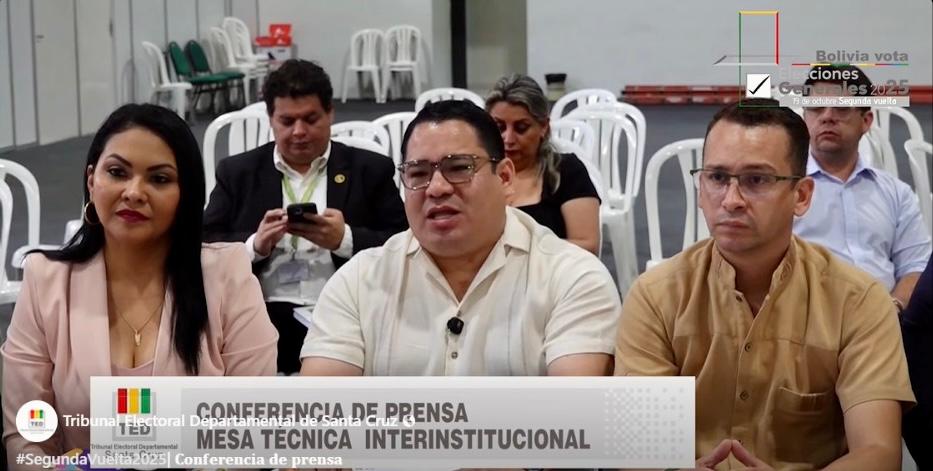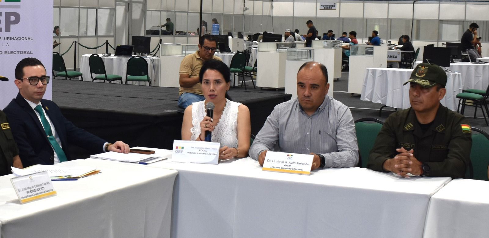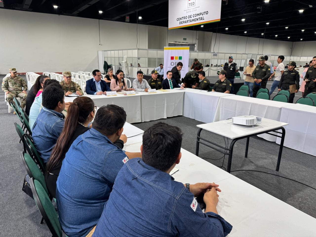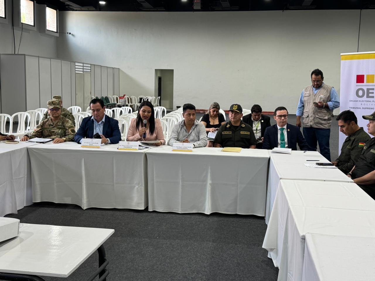 La Sala Plena del TED Santa Cruz encabezó una mesa técnica interinstitucional con la presencia de los vocales del Tribunal Supremo Electoral Yajaira San Martín y Gustavo Ávila, además del presidente del Tribunal Supremo de Justicia, Romer Saucedo; el fiscal general del Estado, Roger Mariaca; el fiscal departamental, Alberto Ceballos; el presidente del Tribunal Departamental de Justicia, Aldo Quezada; el comandante departamental de la Policía, Rolando Rojas, y representantes de los gobiernos departamental y municipal.