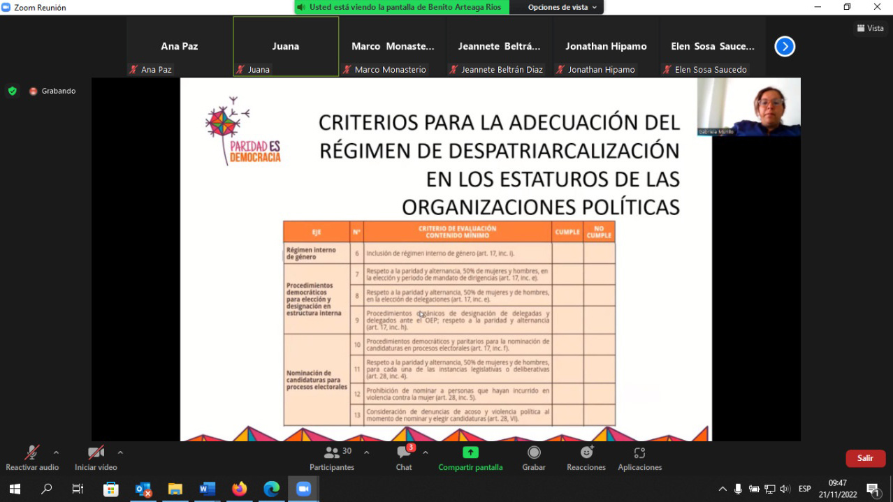 El Tribunal Electoral Departamental (TED) Santa Cruz llevó adelante el taller virtual de “Análisis sobre la participación política de las mujeres y presentación de la oferta de formación”, con representantes de las agrupaciones ciudadanas e hizo la presentación de la oferta de formación, a la que asistieron más de 30 delegados y delegadas, miembros de la instancia de despatriarcalización o de género del comité de ética y lideresas, entre otros representantes de organizaciones políticas de Santa Cruz.