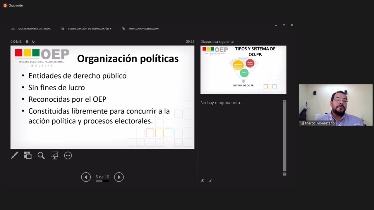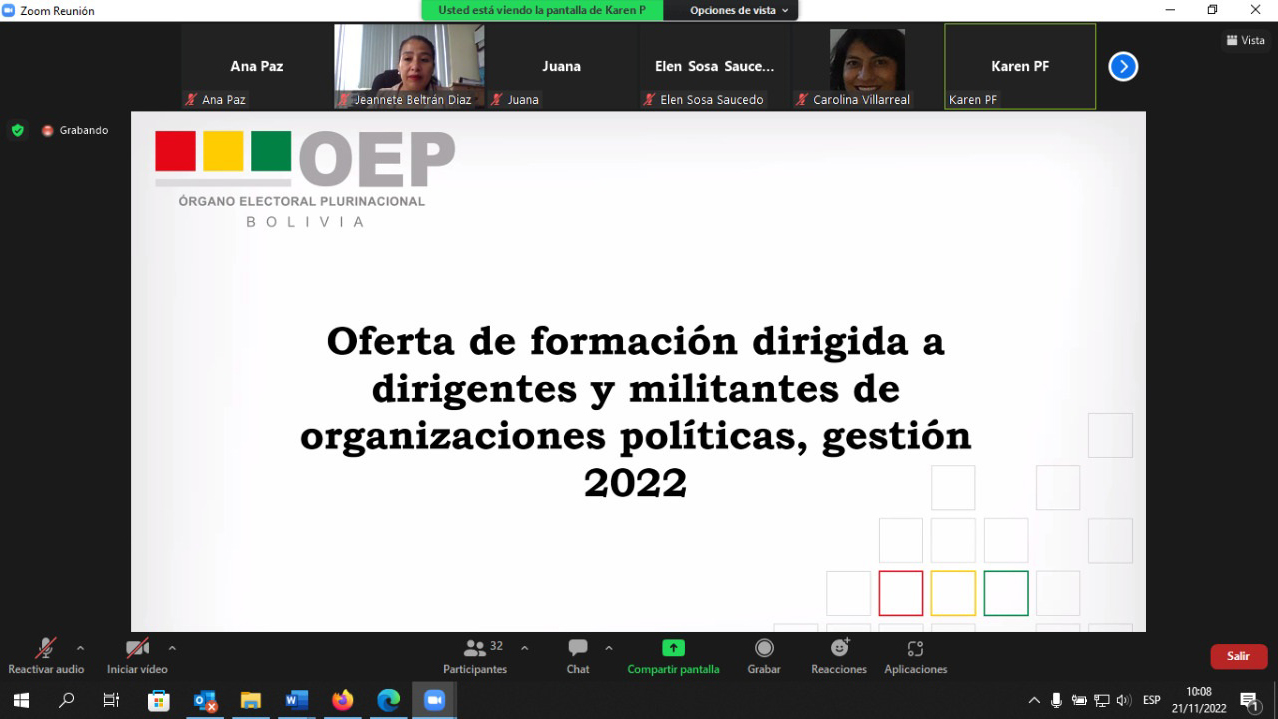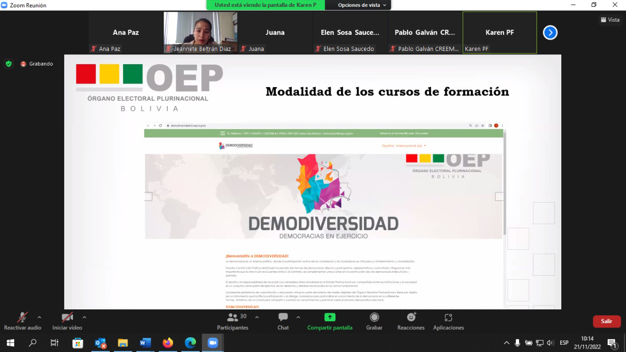 “En Santa Cruz las y los representantes y militantes de las agrupaciones ciudadanas podrán ser parte de dos cursos virtuales gratuitos que está ofertando el Órgano Electoral Plurinacional, a partir del 28 de noviembre de esta gestión”, aseveró la autoridad electoral.