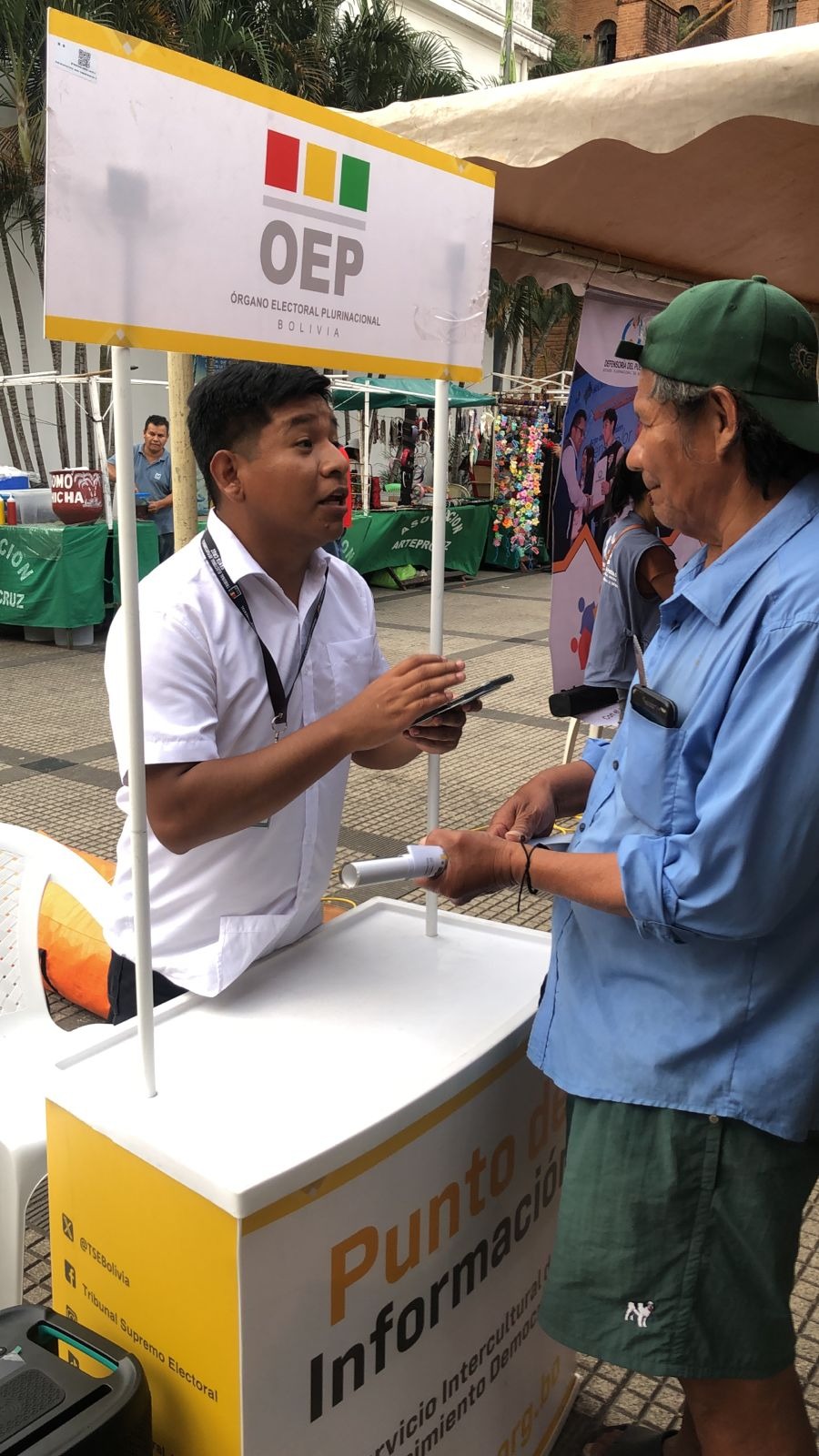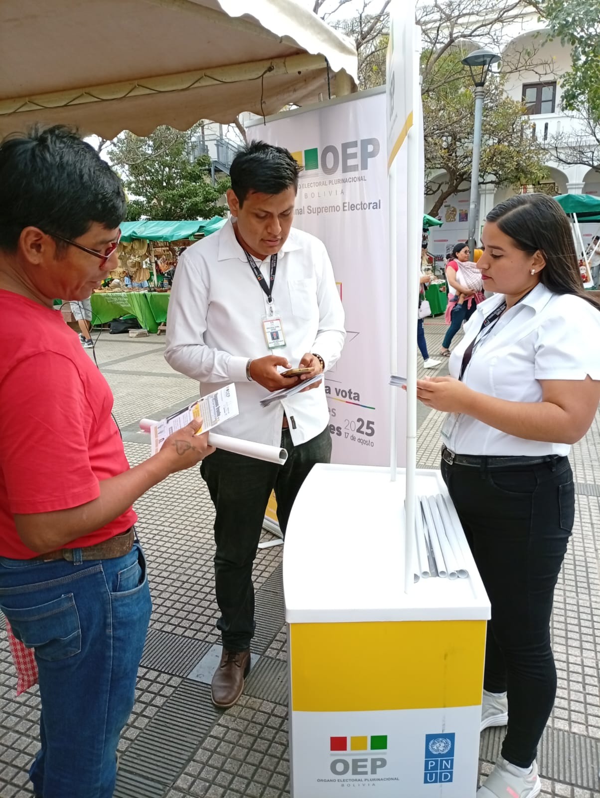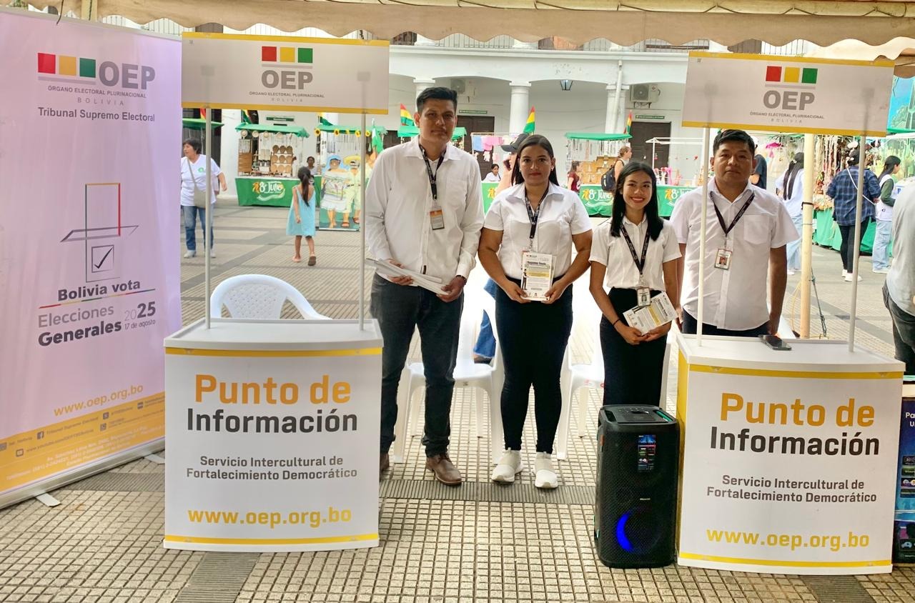 El Tribunal Electoral Departamental (TED) de Santa Cruz, a través de un equipo de socializadores del Servicio Intercultural de Fortalecimiento Democrático (Sifde), participó en el espacio itinerante de la Feria de la Democracia, desarrollado en la Manzana 1 de la capital cruceña, con el propósito de promover un voto consciente y responsable entre las y los jóvenes, y ciudadanía en general, rumbo a las Elecciones Generales del 17 de agosto.