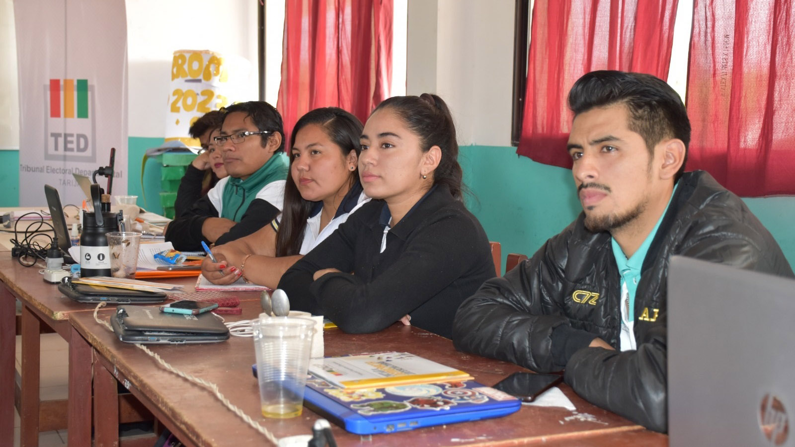 “Técnicos del Servicio Intercultural de Fortalecimiento Democrático del TED Tarija capacitaron en la modalidad virtual y presencial a estudiantes de la Escuela Superior de Formación de Maestros Juan Misael Saracho, en la localidad de Canasmoro, y en las Unidades Académicas Tarija, en Guerrahuayco, y Gran Chaco, en la comunidad de Caiza del municipio de Yacuiba”, informó la autoridad.