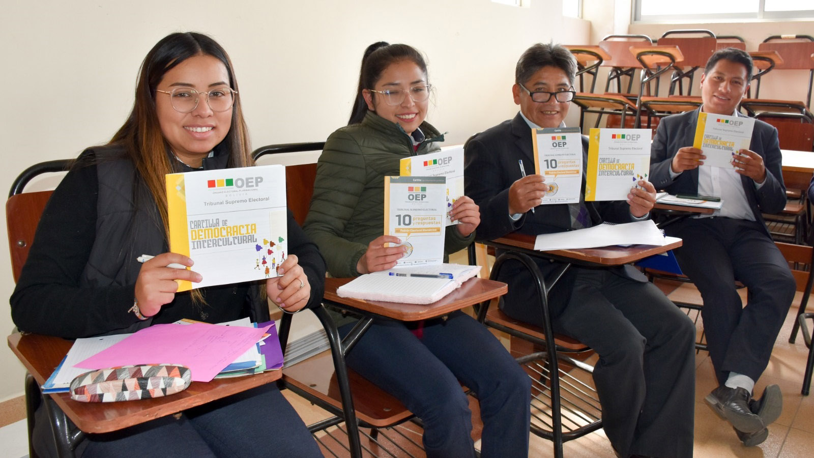 La capacitación sobre democracia intercultural se dividió en tres módulos: 1. bases, estructura y organización del Estado Plurinacional, 2. formas y mecanismos de la democracia intercultural, y 3. la participación de las mujeres en las democracias. En el taller presencial, los estudiantes realizaron trabajos de retroalimentación y finalmente una evaluación escrita.