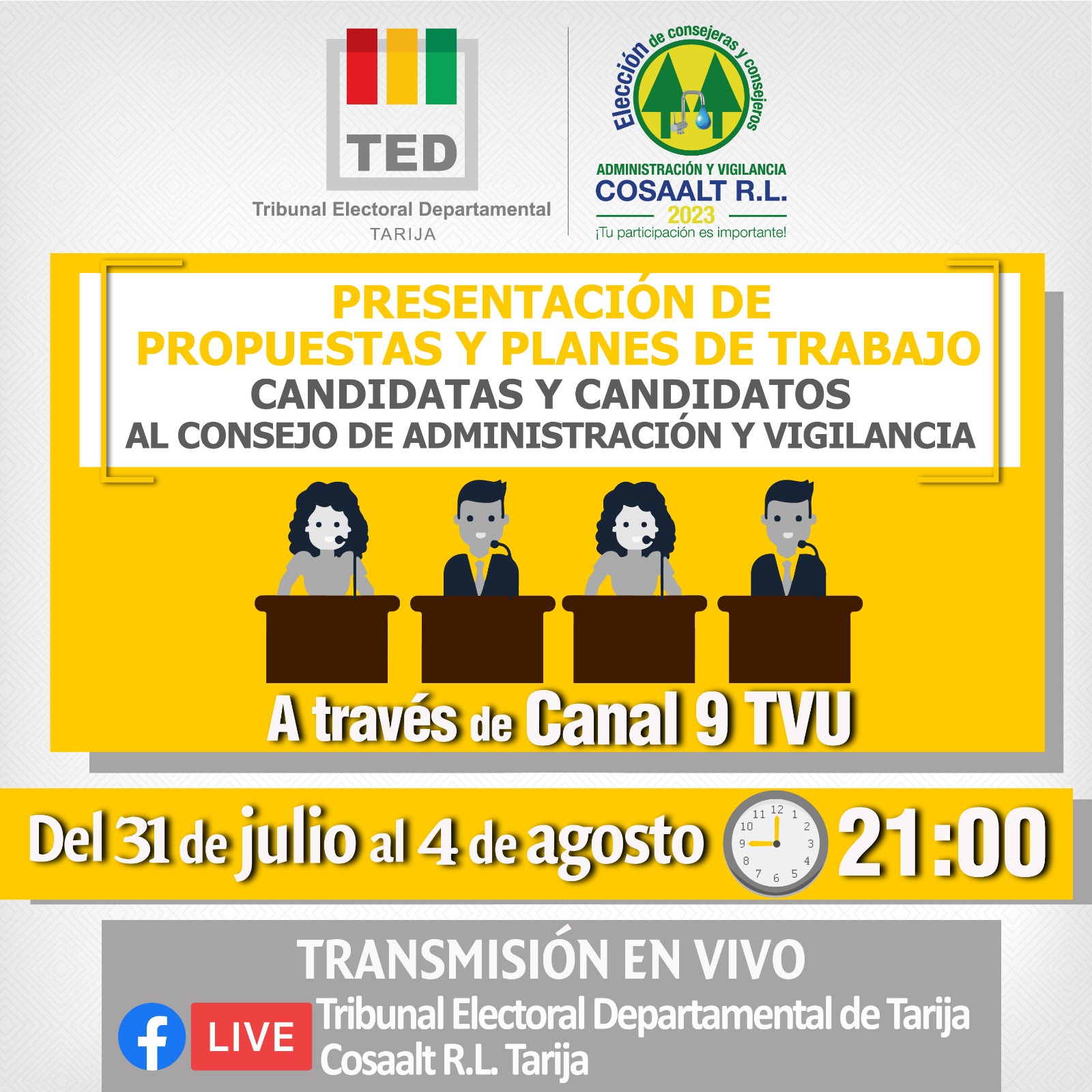 A partir de las 21:00 horas de este lunes 31 de julio, las candidatas y candidatos del Consejo de Administración y Vigilancia de la Cooperativa de Servicios Públicos de Agua Potable y Alcantarillado Sanitario Tarija (Cosaalt RL) presentarán sus propuestas y planes de trabajo por Canal 9 Televisión Universitaria (TVU) y las páginas oficiales de Facebook del Tribunal Electoral Departamental (TED) de Tarija y de Cosaalt RL, rumbo a la elección del domingo 13 de agosto.
