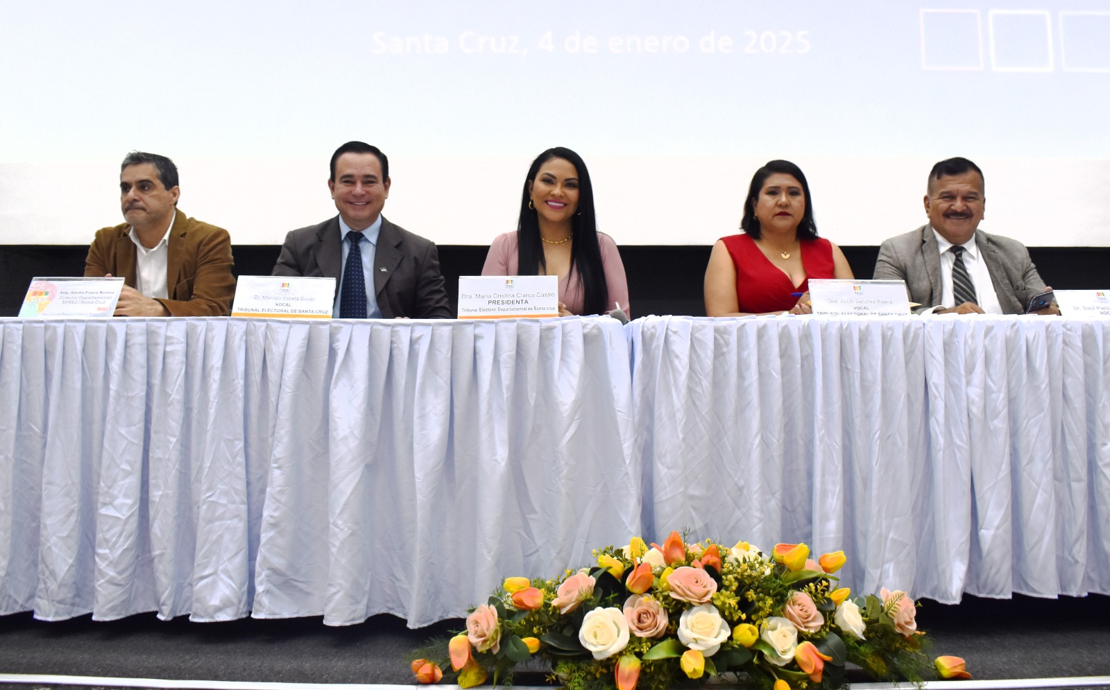 Entre las tareas fundamentales para esta gestión, la presidenta del TED Santa Cruz se refirió a las Elecciones Generales 2025: “Con los resultados del censo de población y vivienda, a través de la Unidad de Geografía y Logística Electoral se hará el trabajo correspondiente a la delimitación de las circunscripciones uninominales y aprobación por Sala Plena para su remisión al Tribunal Supremo Electoral”, acotó.