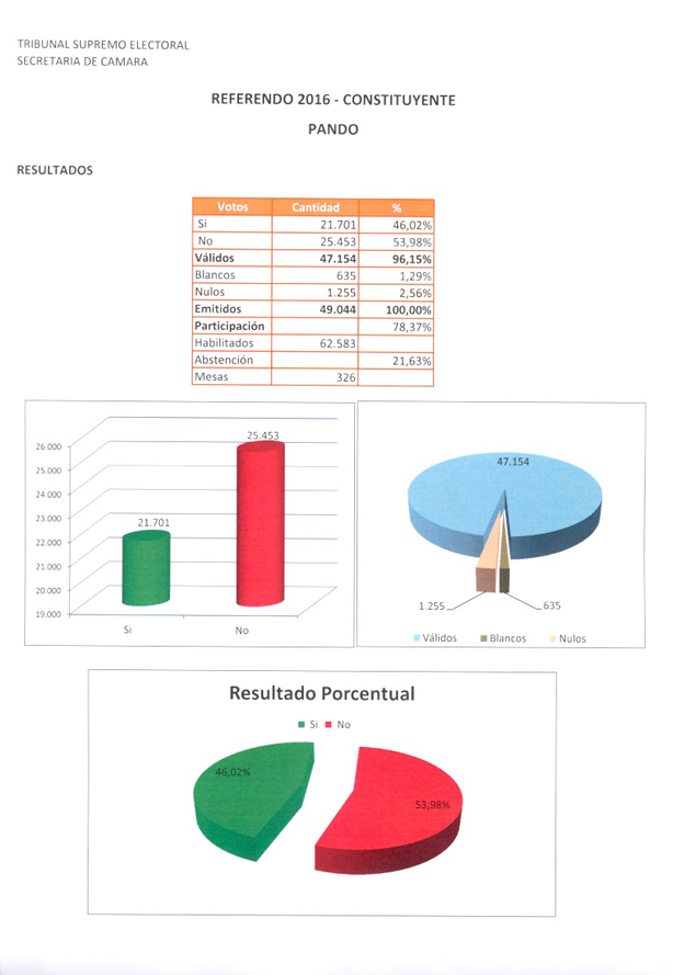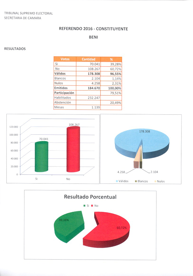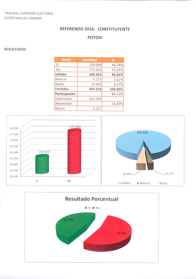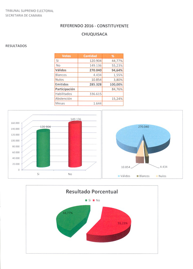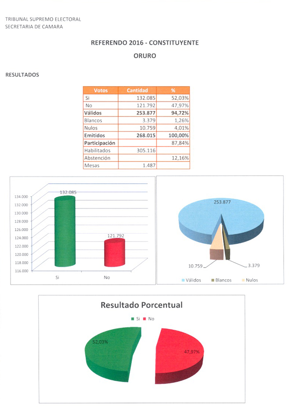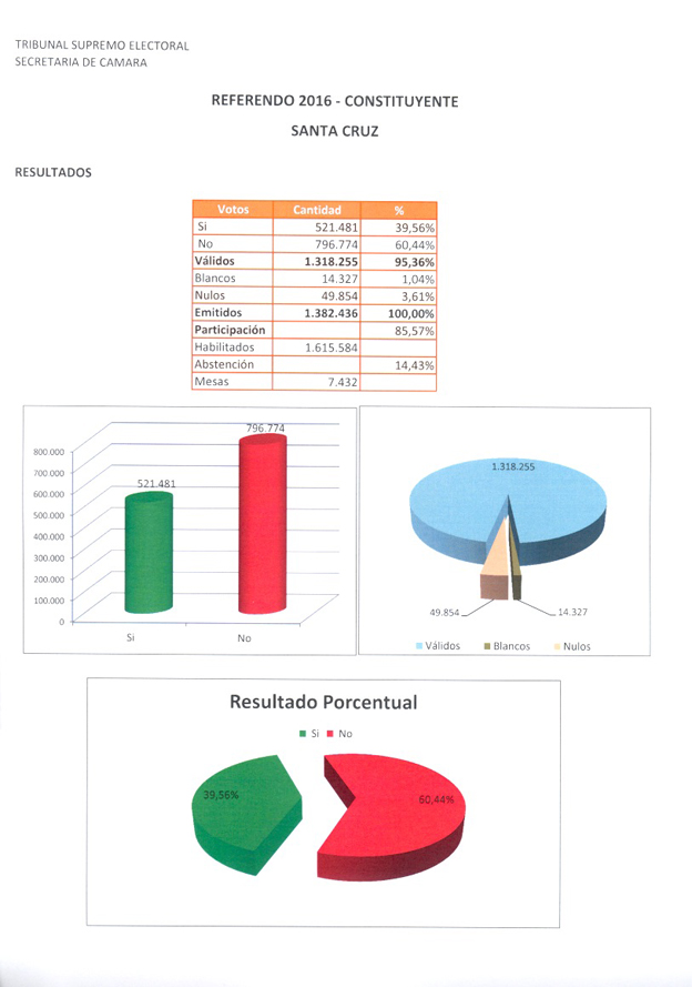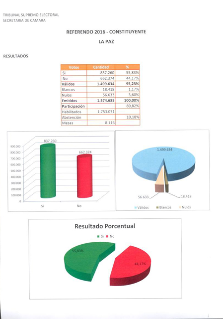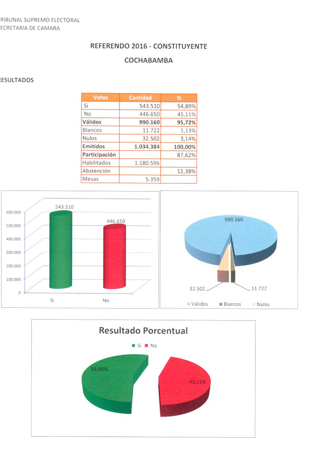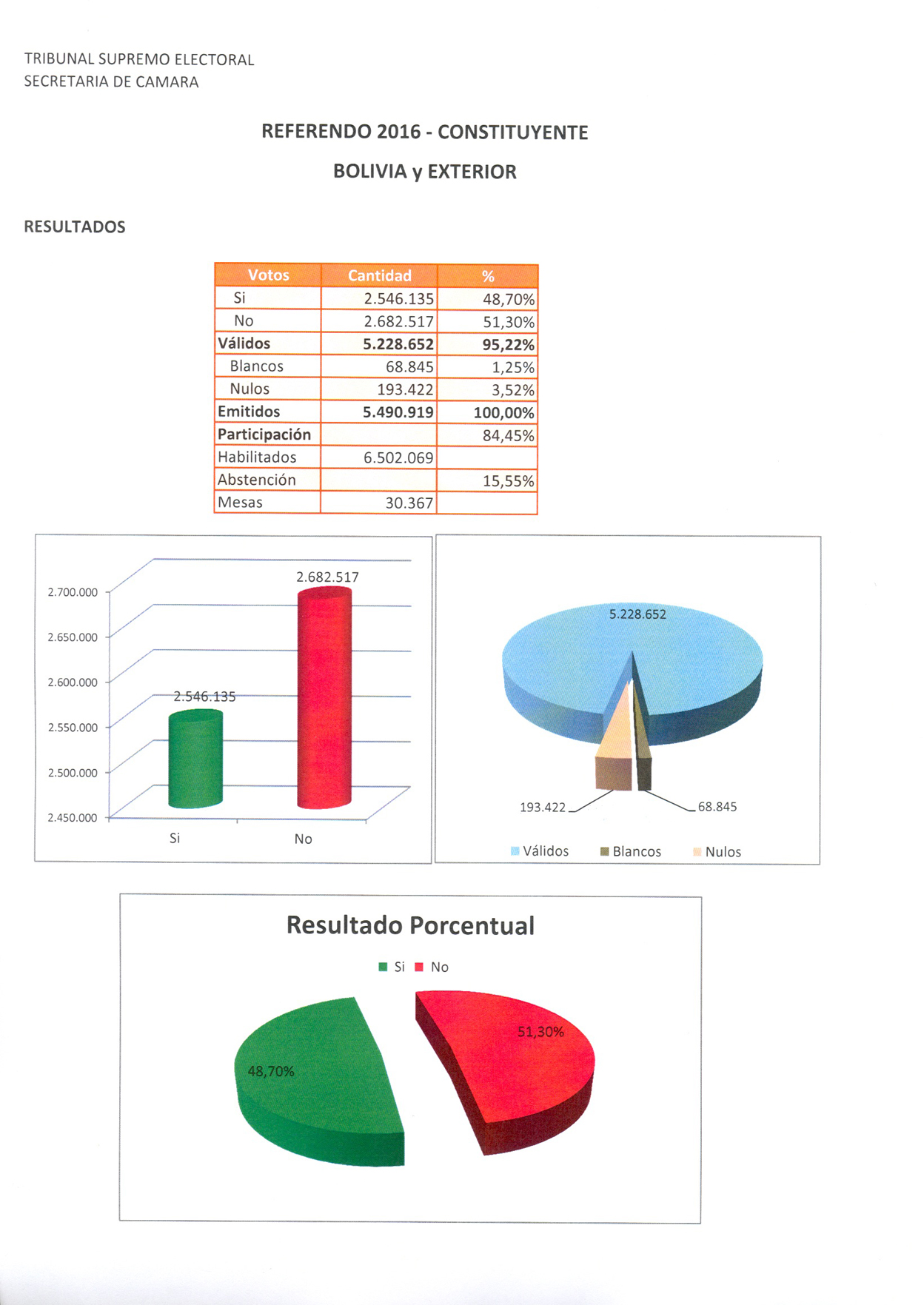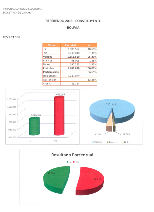 El Tribunal Supremo Electoral (TSE), en el marco del Art. 23 de la Ley Nº 018 del Órgano Electoral y en cumplimiento de la penúltima actividad prevista en el Calendario Electoral, entregó este martes 29 los Resultados Oficiales del Proceso de Referendo a la Asamblea Legislativa Plurinacional.