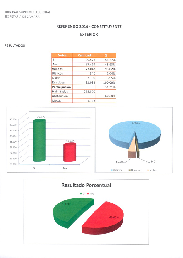 Los resultados consolidados de la votación al 100% de las actas computadas dieron como resultado el 51,30% para el NO y el 48,70% para el Sí.
