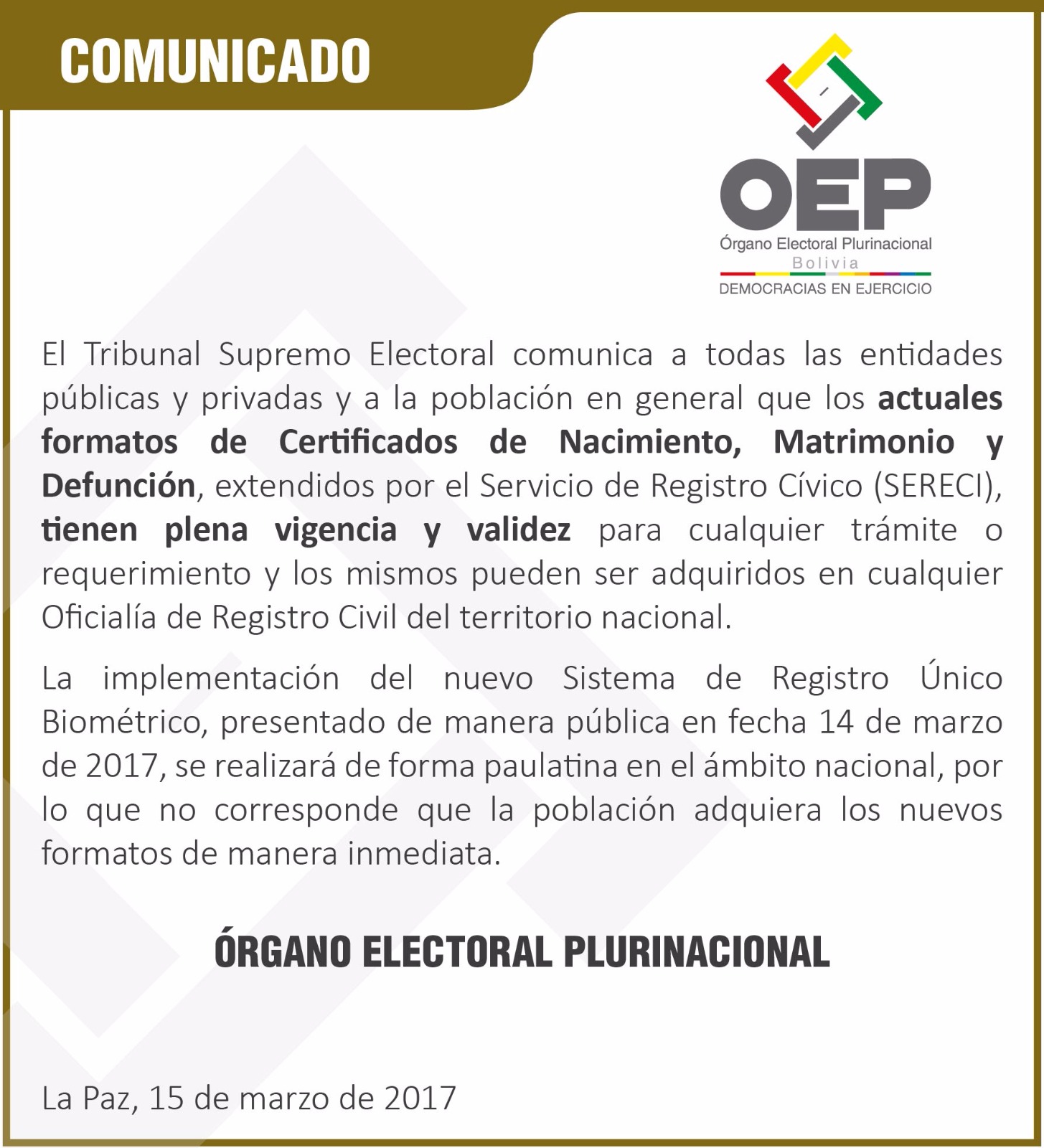 HomeTSE manifiesta que los actuales certificados de registro cívico tienen plena validez comunicadosereci_150317_1