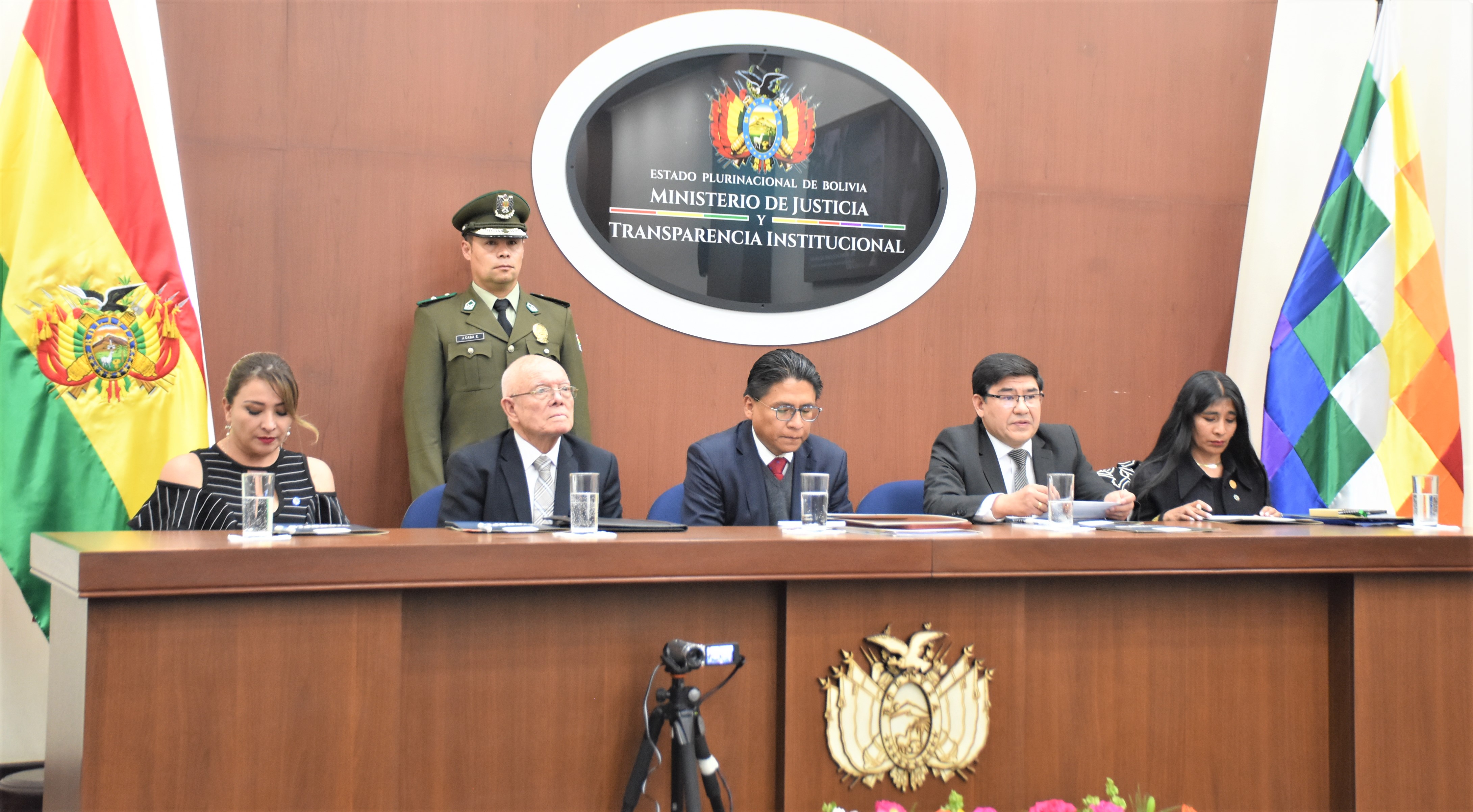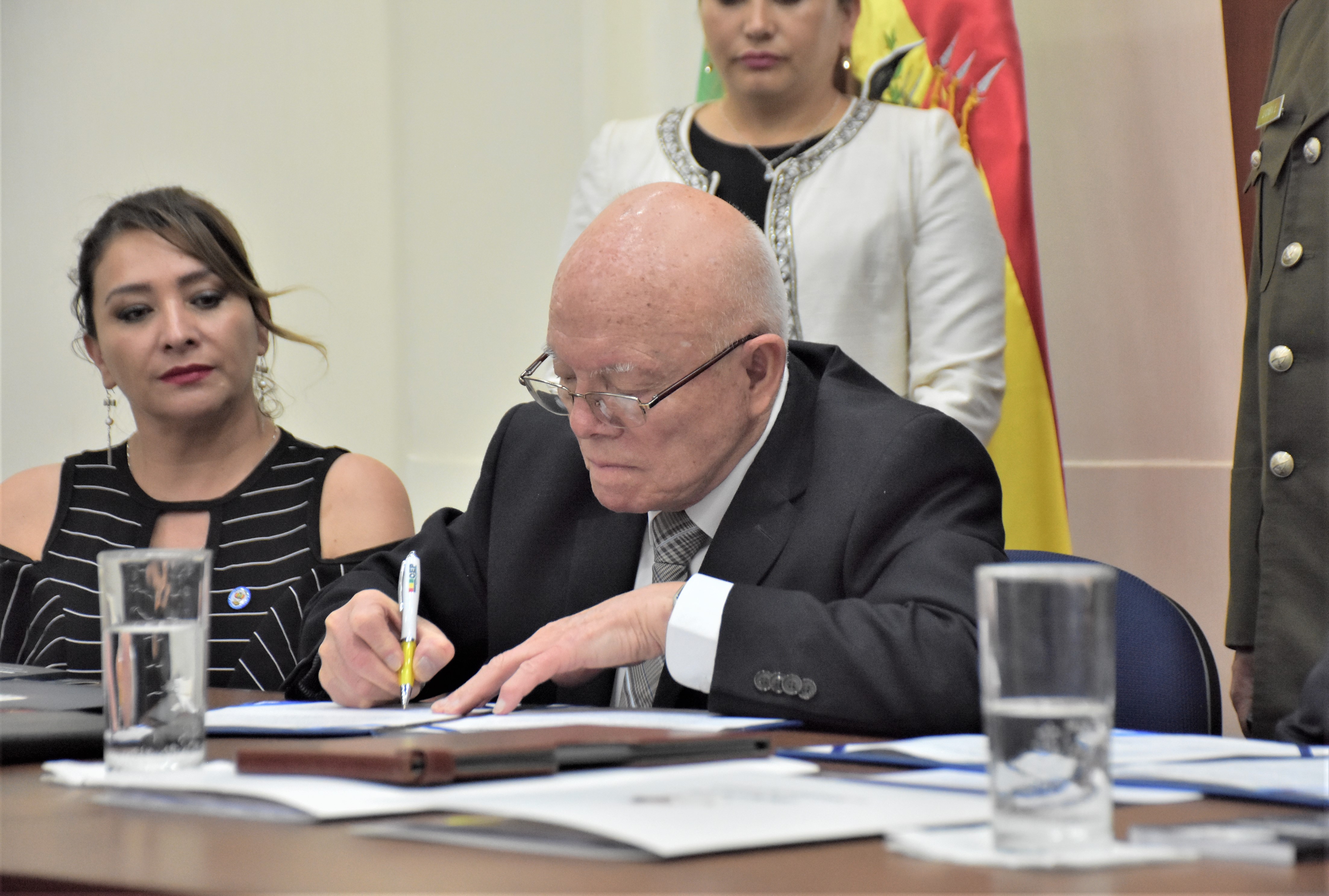 El presidente del Tribunal Supremo Electoral (TSE), Oscar Hassenteufel, y el director del Notariado Plurinacional (Dirnoplu), Milton Barón, suscribieron un convenio de cooperación interinstitucional que tiene por objeto establecer mecanismos tecnológicos para que los notarios puedan contrastar, con carácter restringido y controlado, determinada información en la base de datos que administra el Servicio de Registro Cívico (Serecí), lo que permitirá otorgar mayor seguridad jurídica en la preparación de documentos notariales. En el acto de suscripción del convenio participó también la vocal Dina Chuquimia.