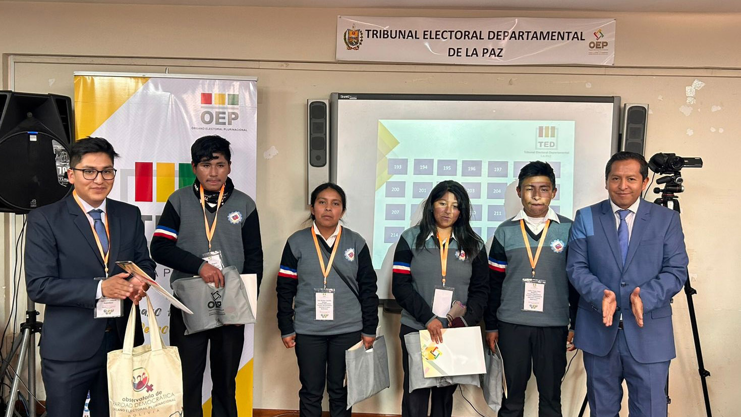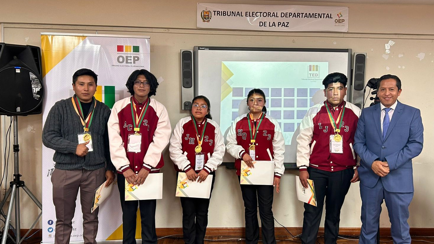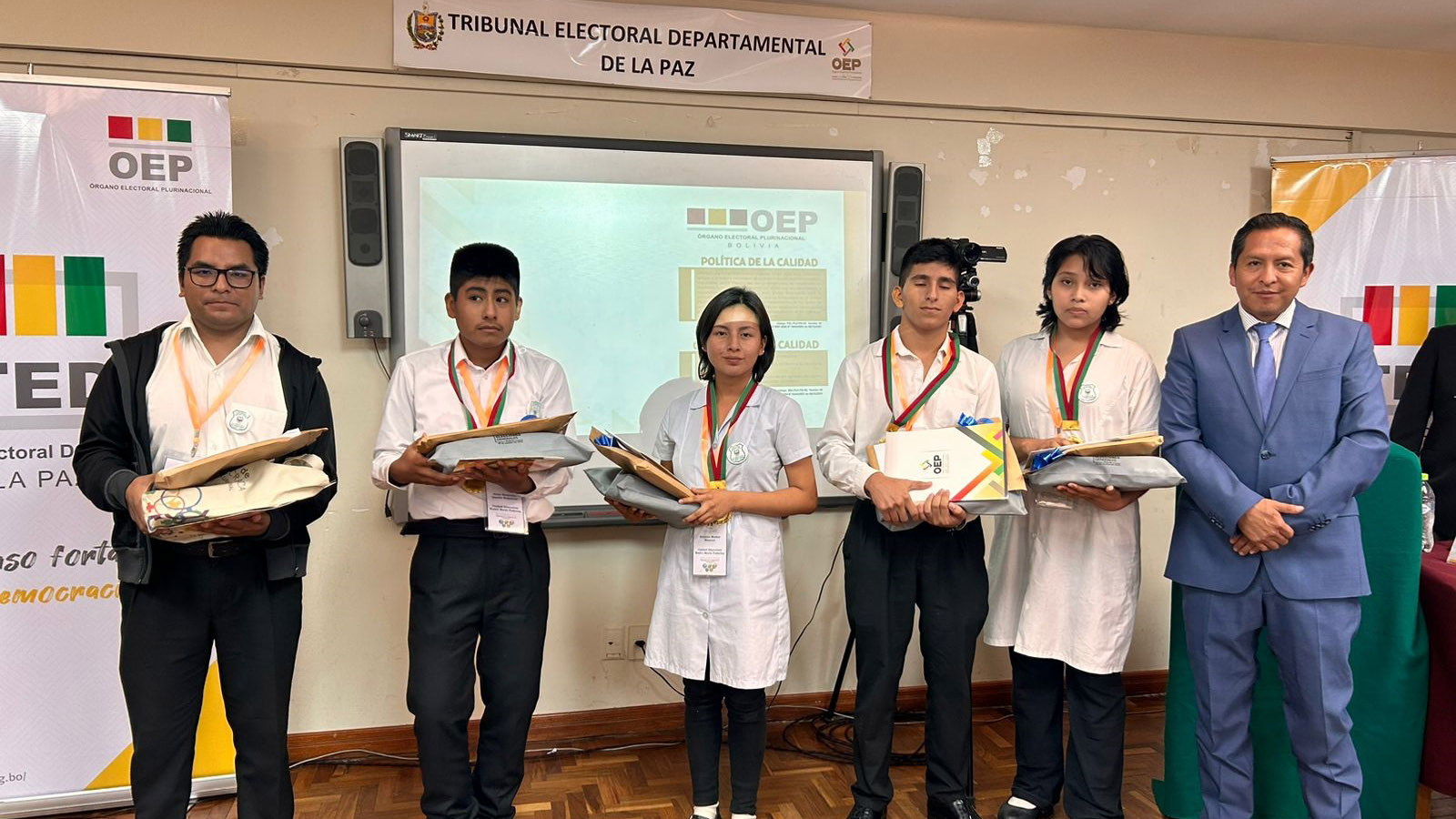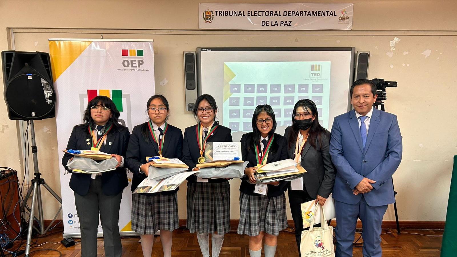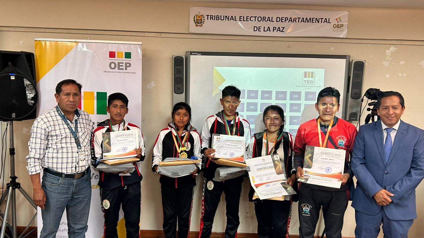 “Ustedes han construido un conocimiento que nadie les va a quitar, eso es valorable. También a los campeones de esta tercera Olimpiada de la Democracia Intercultural con 241 equipos inscritos, siéntanse orgullosos porque han empezado desde abajo, desde el inicio del sorteo y ahora todos esperamos verlos ganadores a nivel nacional”, sostuvo la autoridad departamental electoral.Los campeones: Vania Evelin Pari Guerra, Dina Aduviri Fernandez, Thomas Edisson Fernandez Sebastián y Cesar Chura Albarracín, recibieron un diploma junto a una medalla como ganadores de la tercera versión de las Olimpiadas de la Democracia Intercultural en La Paz, además de un premio económico recaudado por los servidores públicos y vocales del TED La Paz.