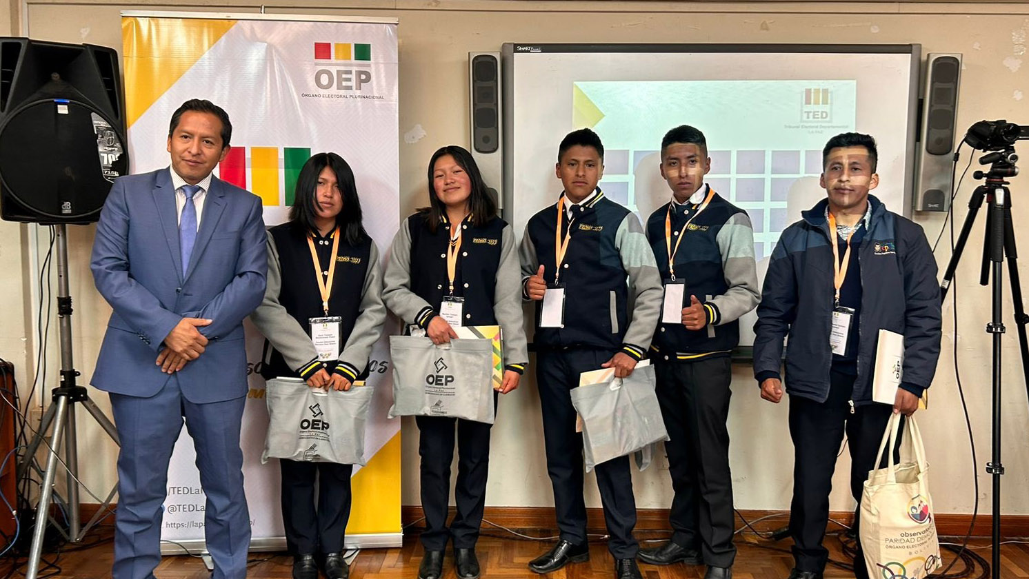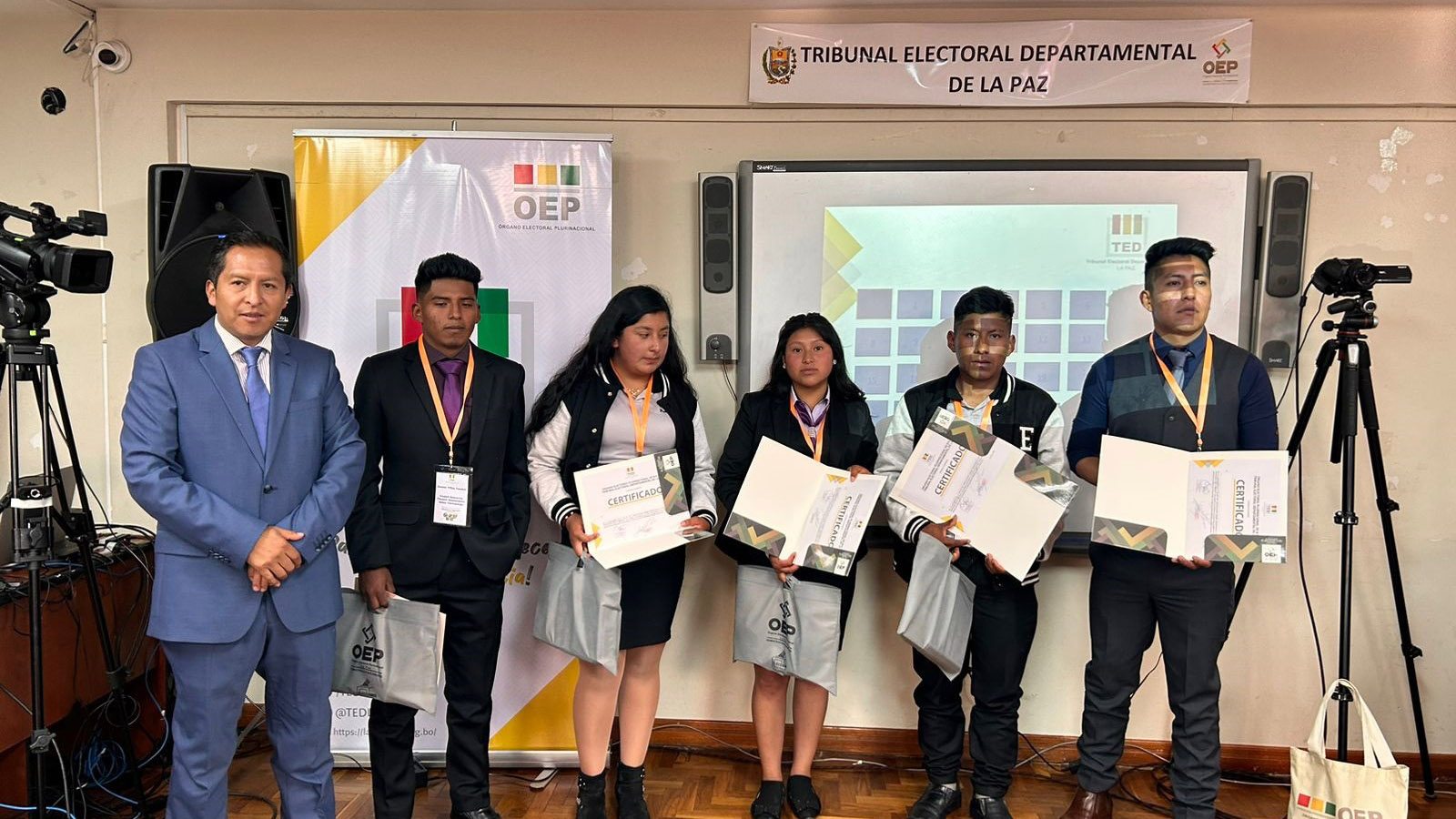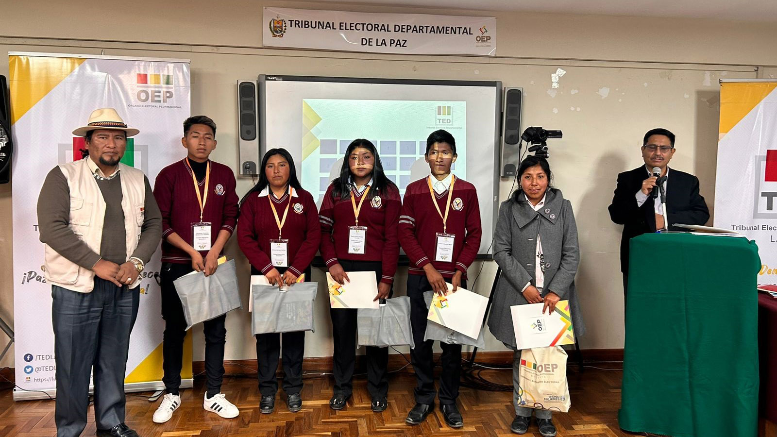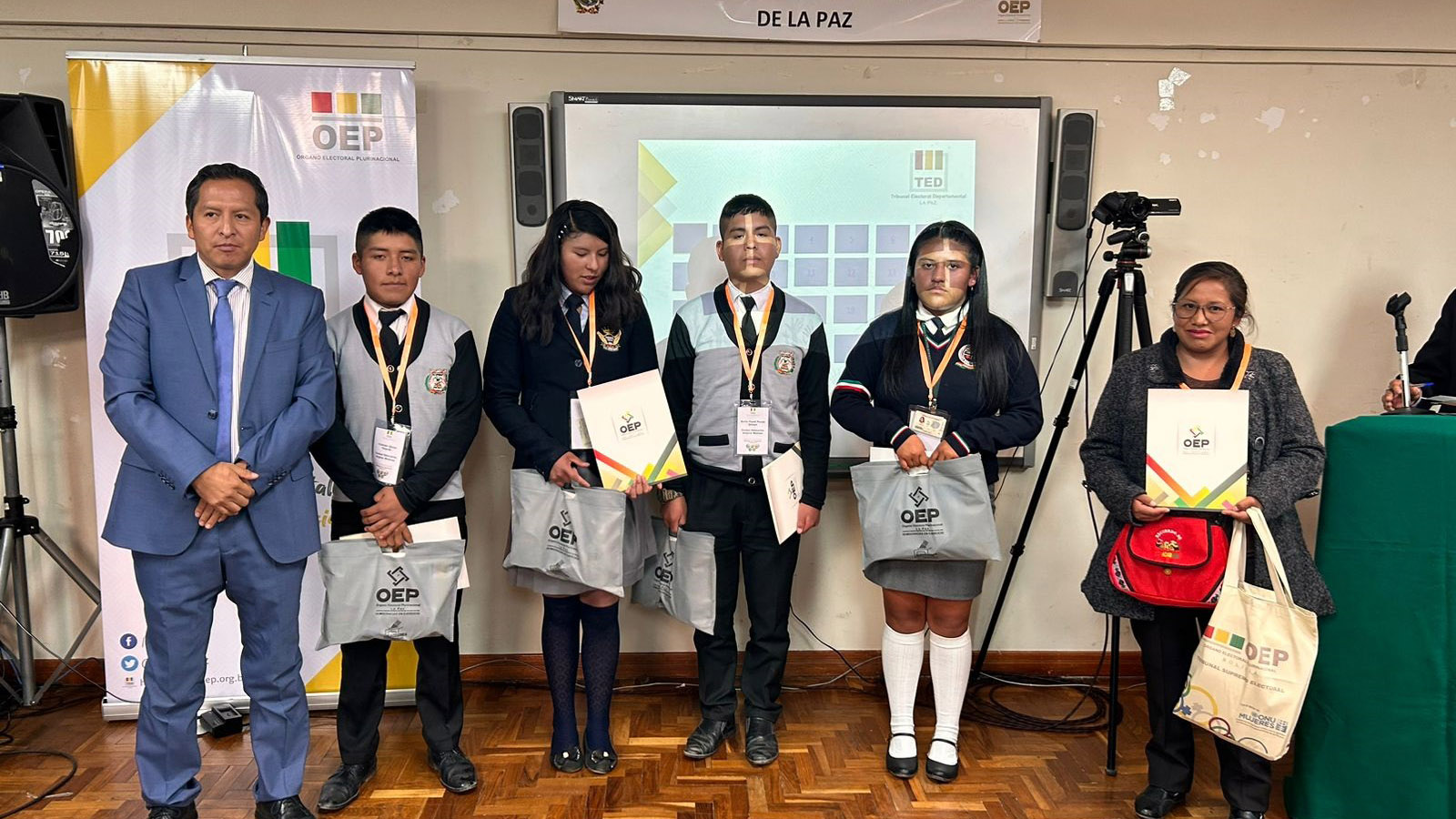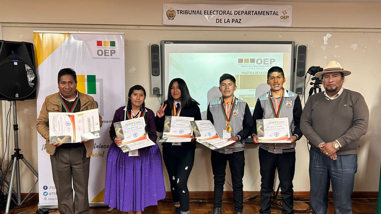 “Ustedes han construido un conocimiento que nadie les va a quitar, eso es valorable. También a los campeones de esta tercera Olimpiada de la Democracia Intercultural con 241 equipos inscritos, siéntanse orgullosos porque han empezado desde abajo, desde el inicio del sorteo y ahora todos esperamos verlos ganadores a nivel nacional”, sostuvo la autoridad departamental electoral.Los campeones: Vania Evelin Pari Guerra, Dina Aduviri Fernandez, Thomas Edisson Fernandez Sebastián y Cesar Chura Albarracín, recibieron un diploma junto a una medalla como ganadores de la tercera versión de las Olimpiadas de la Democracia Intercultural en La Paz, además de un premio económico recaudado por los servidores públicos y vocales del TED La Paz.