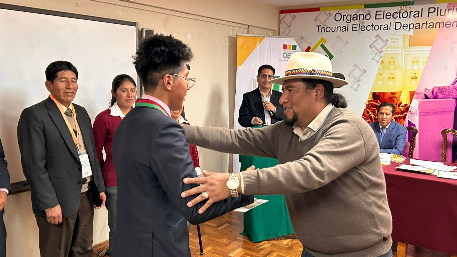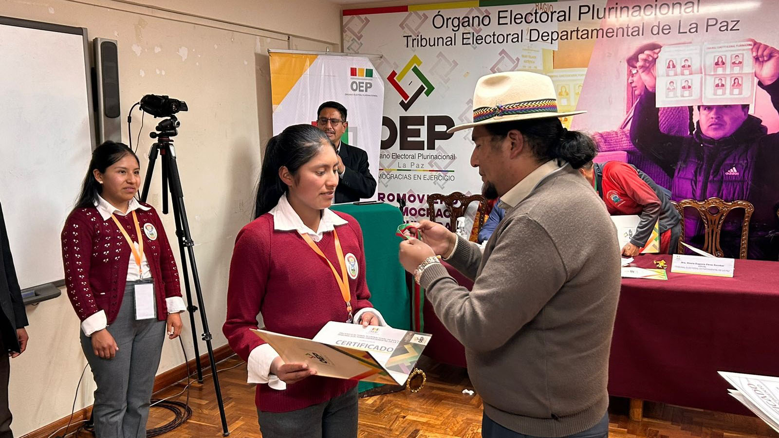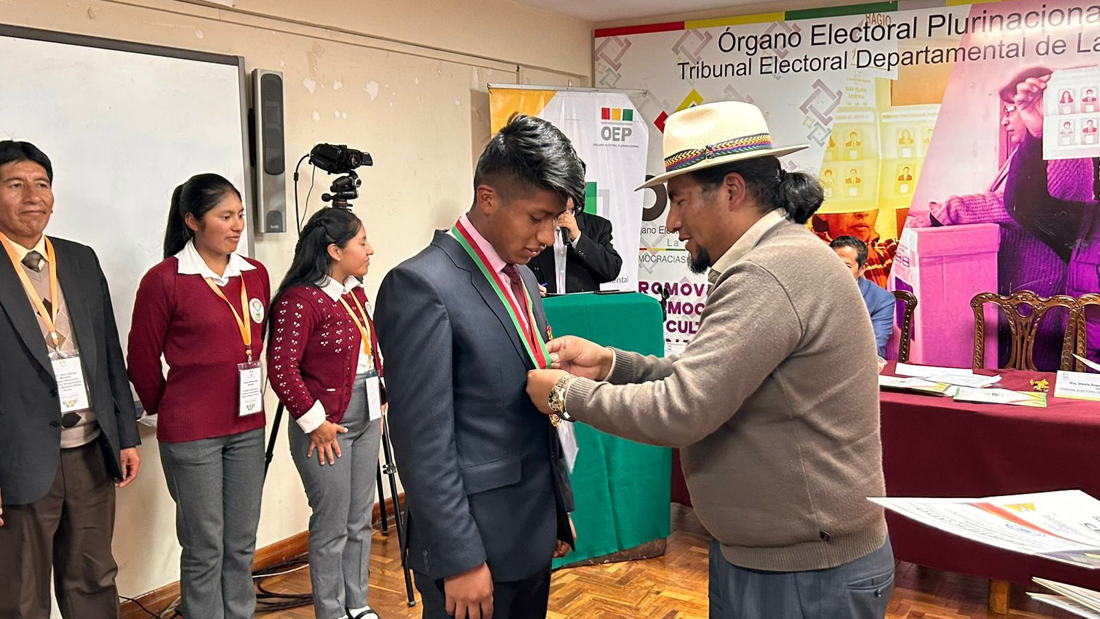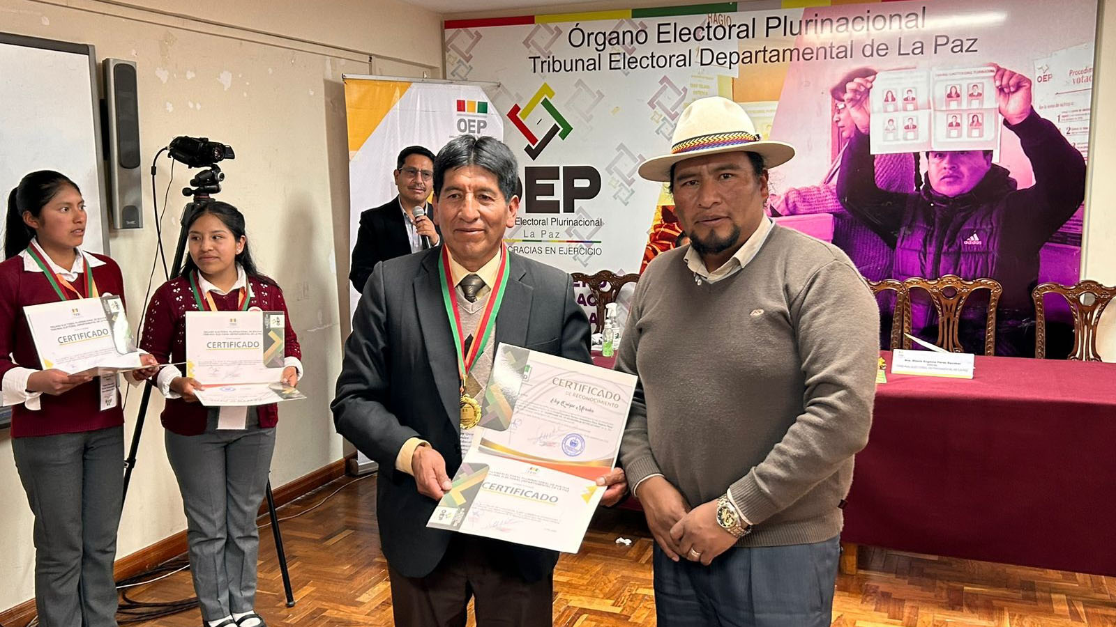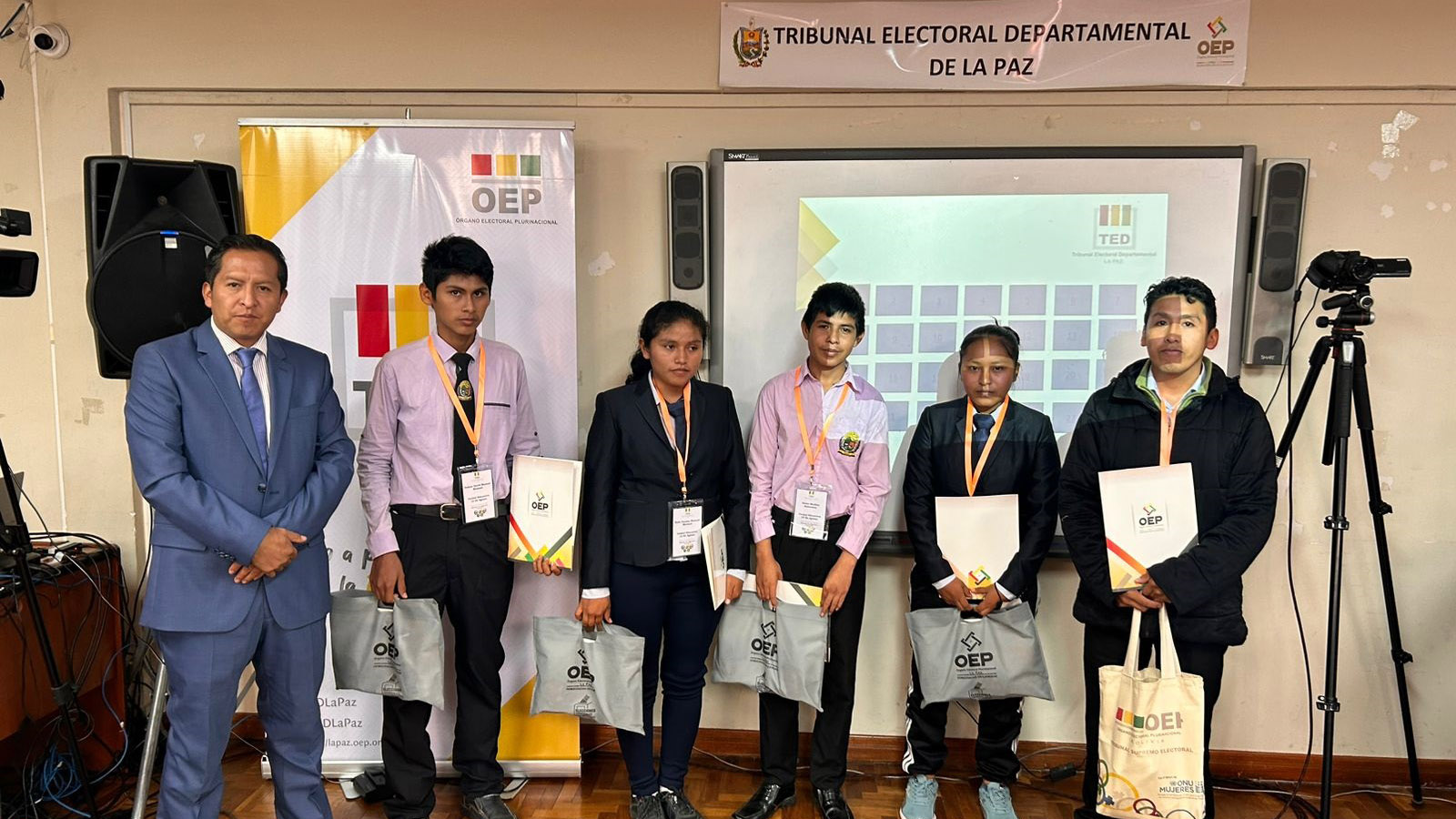 “Ustedes han construido un conocimiento que nadie les va a quitar, eso es valorable. También a los campeones de esta tercera Olimpiada de la Democracia Intercultural con 241 equipos inscritos, siéntanse orgullosos porque han empezado desde abajo, desde el inicio del sorteo y ahora todos esperamos verlos ganadores a nivel nacional”, sostuvo la autoridad departamental electoral.Los campeones: Vania Evelin Pari Guerra, Dina Aduviri Fernandez, Thomas Edisson Fernandez Sebastián y Cesar Chura Albarracín, recibieron un diploma junto a una medalla como ganadores de la tercera versión de las Olimpiadas de la Democracia Intercultural en La Paz, además de un premio económico recaudado por los servidores públicos y vocales del TED La Paz.