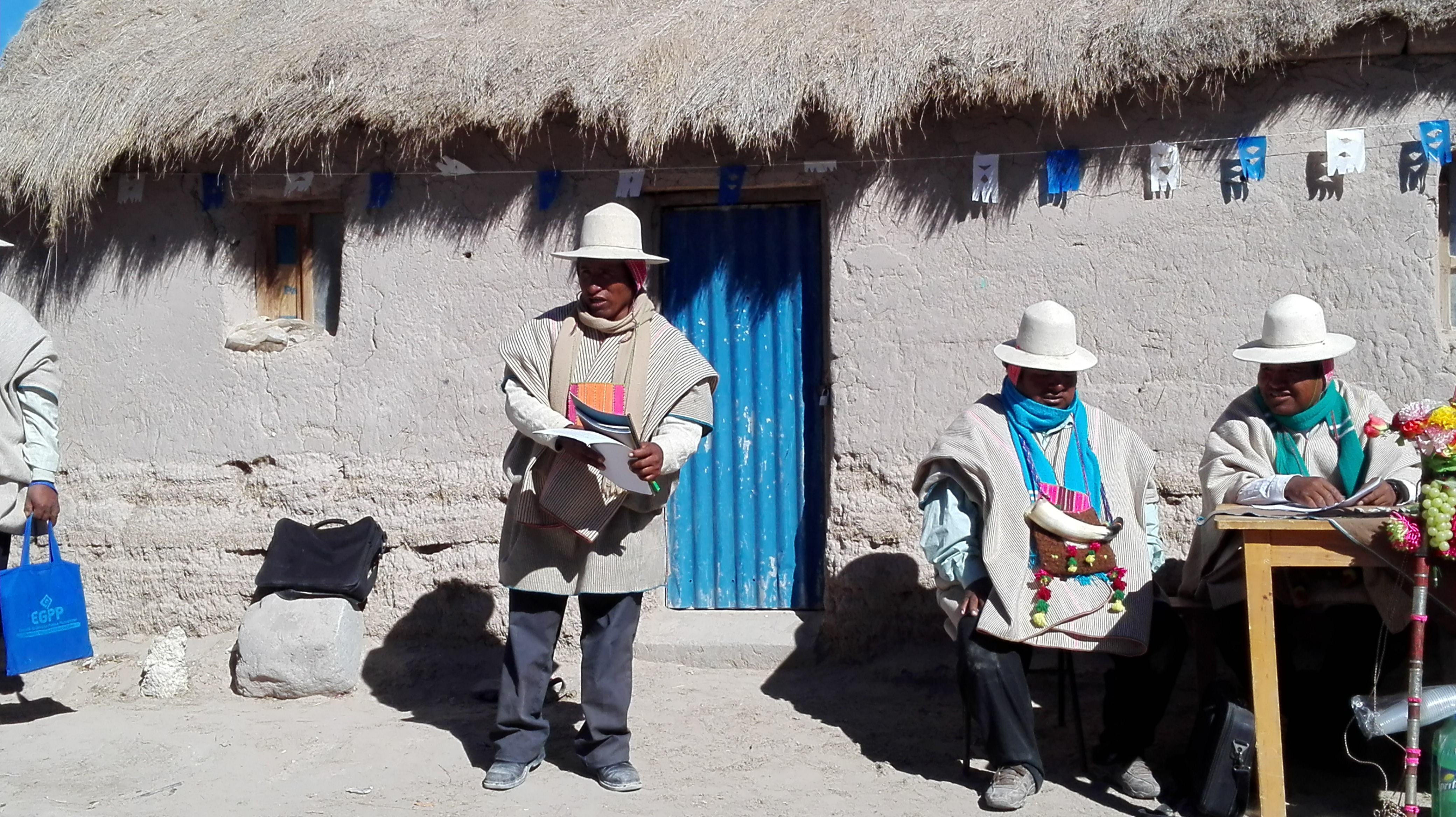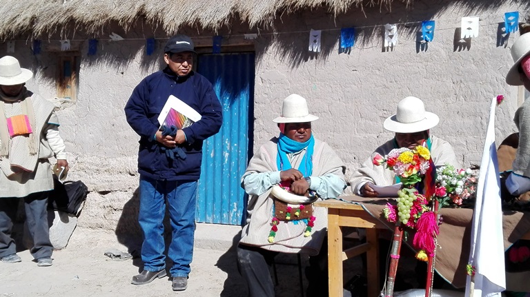 Desde las 9:30 de la mañana hora prevista en la convocatoria, empezaron a llegar las y los comunarios de Wistrullani a la sede del ayllu. Todos vestidos con sus galas tradicionales tomaron asiento sobre los improvisados asientos de tablas en el patio o sobre la misma tierra, como en el caso de las mujeres.