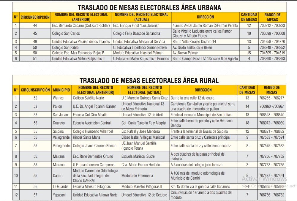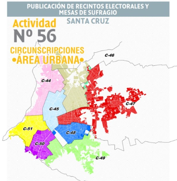 De acuerdo con la publicación y difusión de mesas de sufragio (recintos, asientos, circunscripciones uninominal y especial) que realizó el TED de Santa Cruz, los recintos y las mesas de sufragio que fueron objeto del traslado en el área urbana corresponden a las circunscripciones 44, 45, 49, 50 y 51, y, en el área rural, a la 52, 53, 55, 56 y 57.