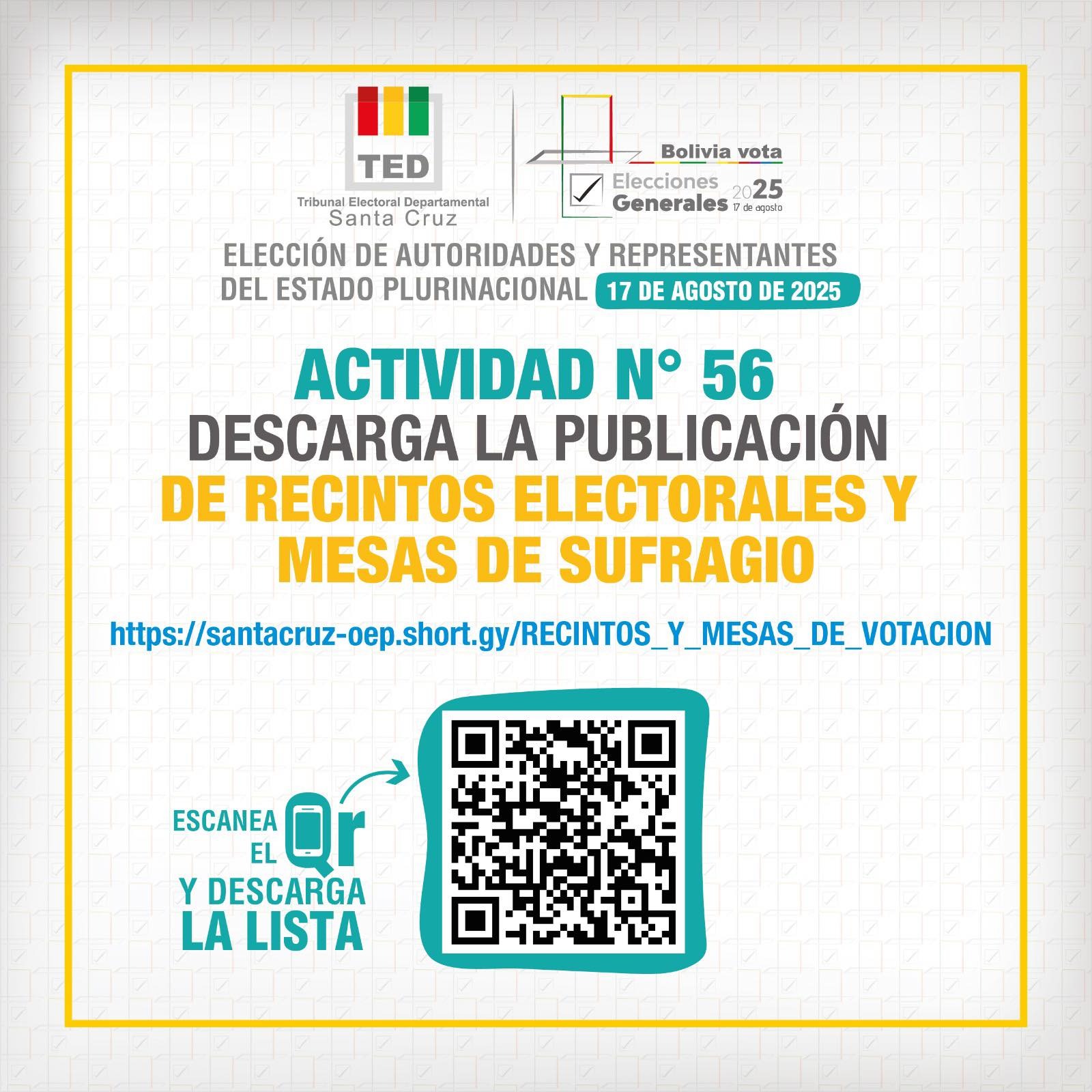 En cumplimiento de la actividad 56 del calendario electoral, el Tribunal Electoral Departamental (TED) de Santa Cruz publicó, el domingo 10 de agosto, la lista de los recintos electorales y la cantidad de mesas de sufragio de cada uno para la Elección de Autoridades y Representantes del Estado Plurinacional 2025, prevista para el domingo 17 de agosto.