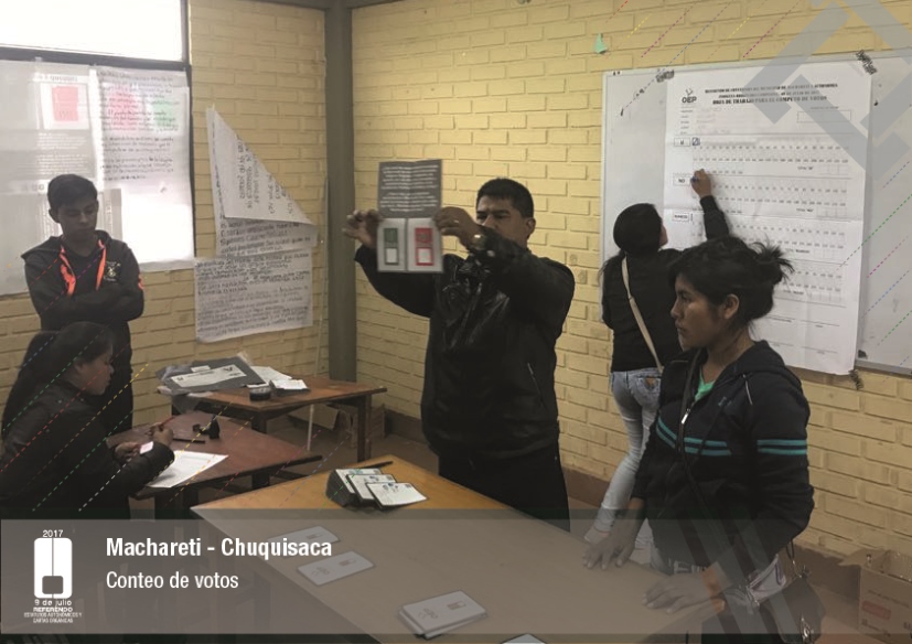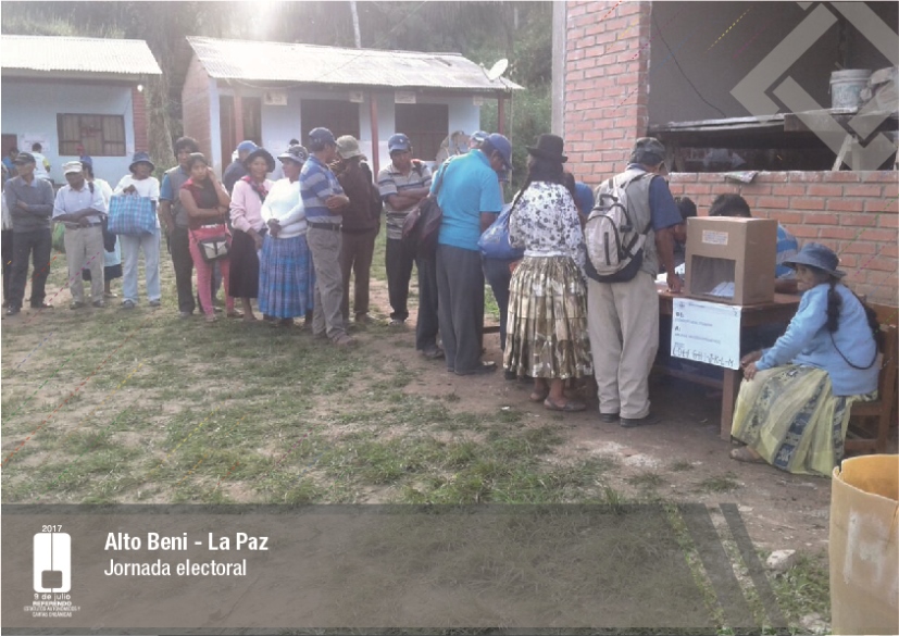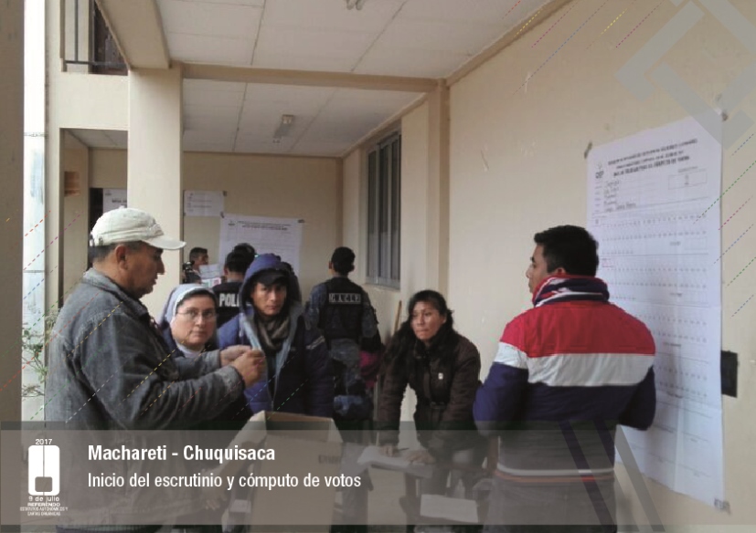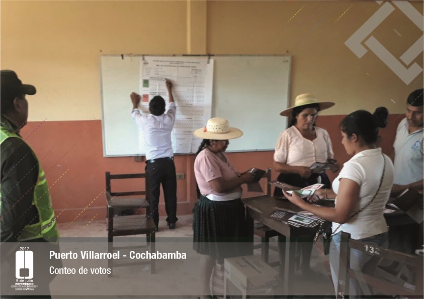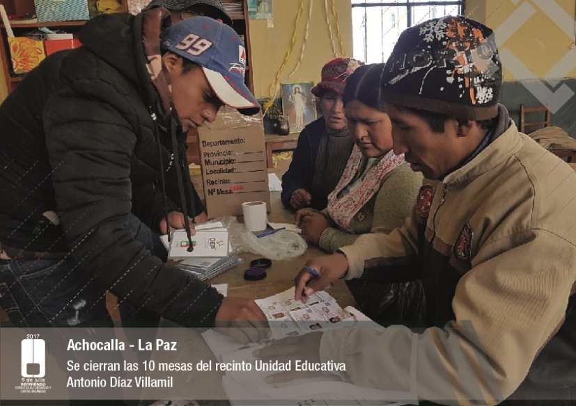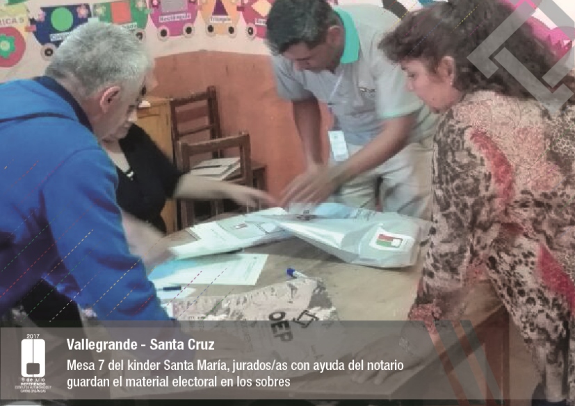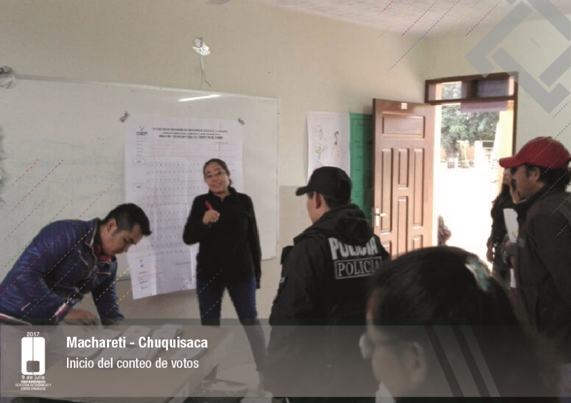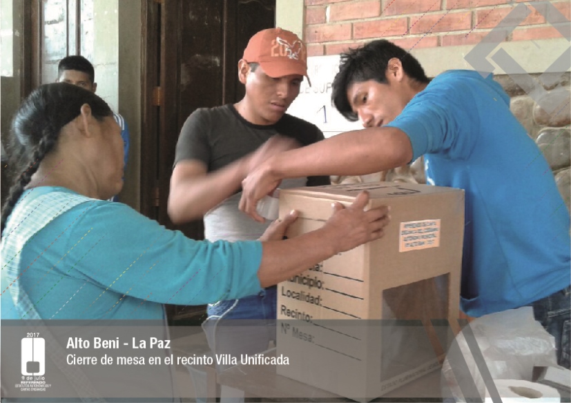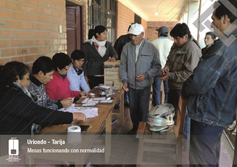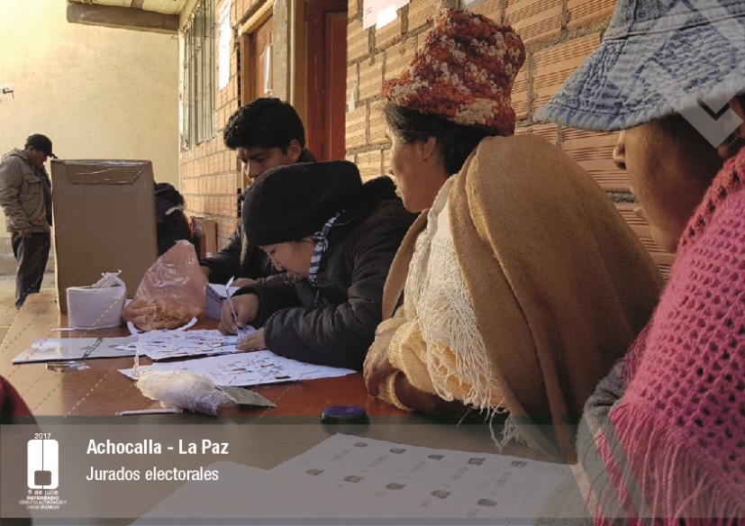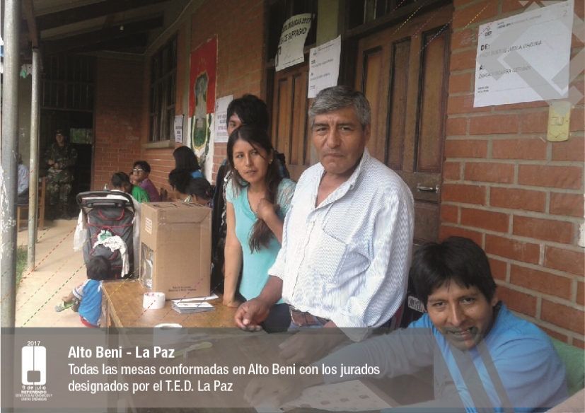 Es así que en Huacaya son 57 jurados para las 9 mesas; en Macharetí 156 para las 26 mesas; en Vallegrande 354 para 59 mesas; en Postrervalle, 42 para siete mesas; en Laja 270 para 45 mesas; en Achocalla 420 para 70 mesas; en Alto Beni, 168 para 28 mesas; Coroico, 300 para 50 mesas; en Shinahota, 396 para 66 mesas; en Sicaya 48 para ocho mesas; en Puerto Villarroel, 840 para 140 mesas; en Antequera 48 para ocho mesas; en Puna 330 para 55 mesas; y en Uriondo, 294 para 49 mesas.