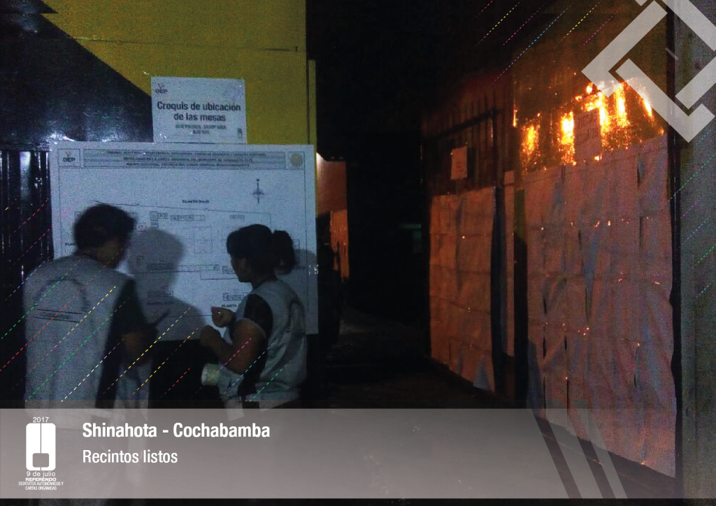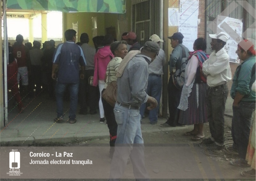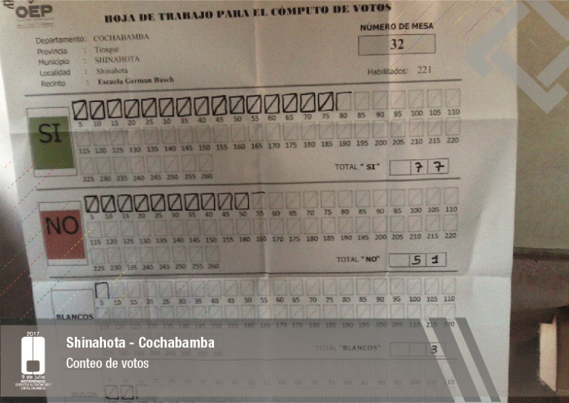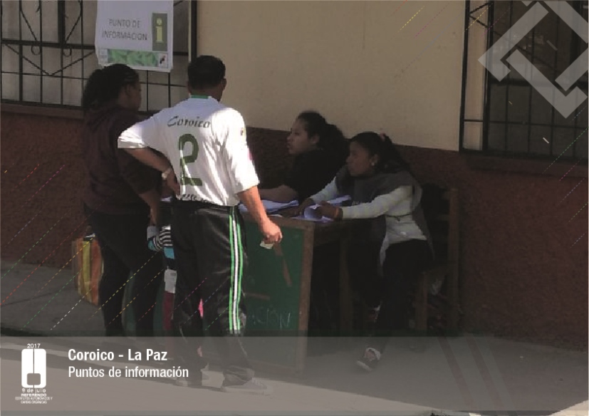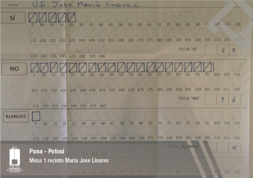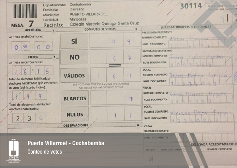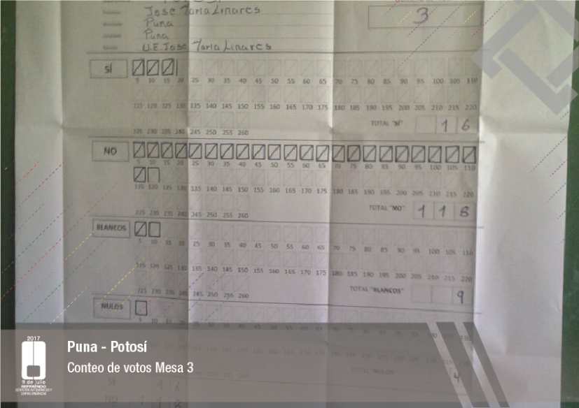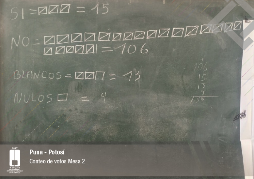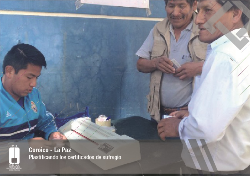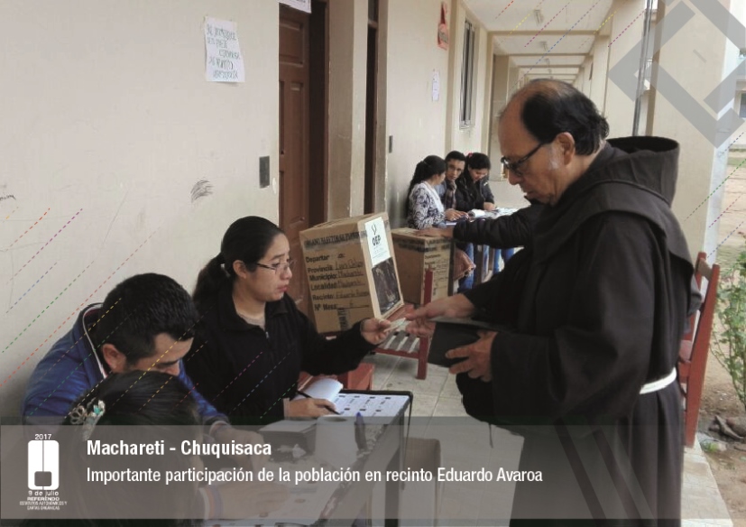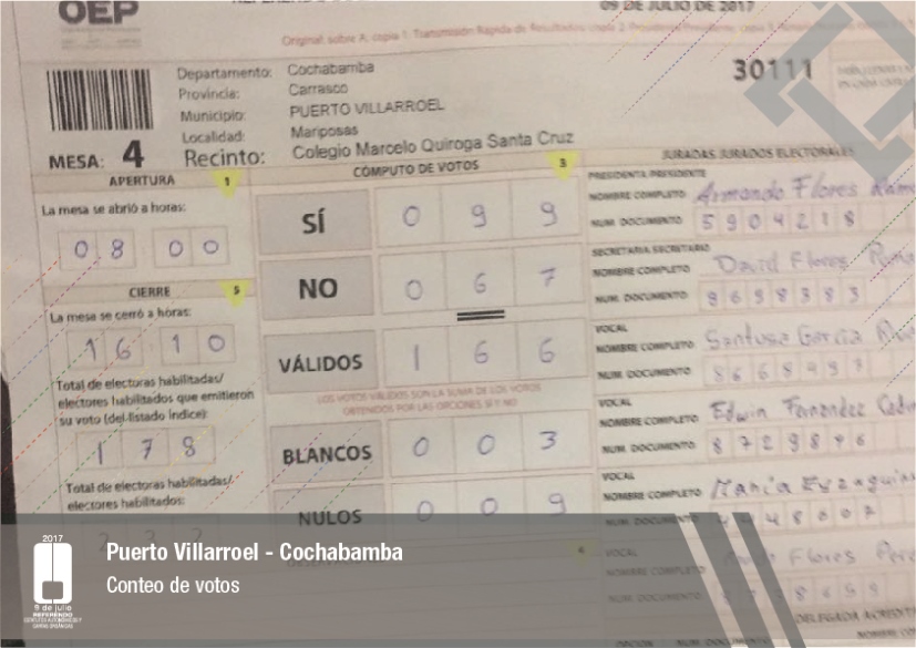 Es así que en Huacaya son 57 jurados para las 9 mesas; en Macharetí 156 para las 26 mesas; en Vallegrande 354 para 59 mesas; en Postrervalle, 42 para siete mesas; en Laja 270 para 45 mesas; en Achocalla 420 para 70 mesas; en Alto Beni, 168 para 28 mesas; Coroico, 300 para 50 mesas; en Shinahota, 396 para 66 mesas; en Sicaya 48 para ocho mesas; en Puerto Villarroel, 840 para 140 mesas; en Antequera 48 para ocho mesas; en Puna 330 para 55 mesas; y en Uriondo, 294 para 49 mesas.